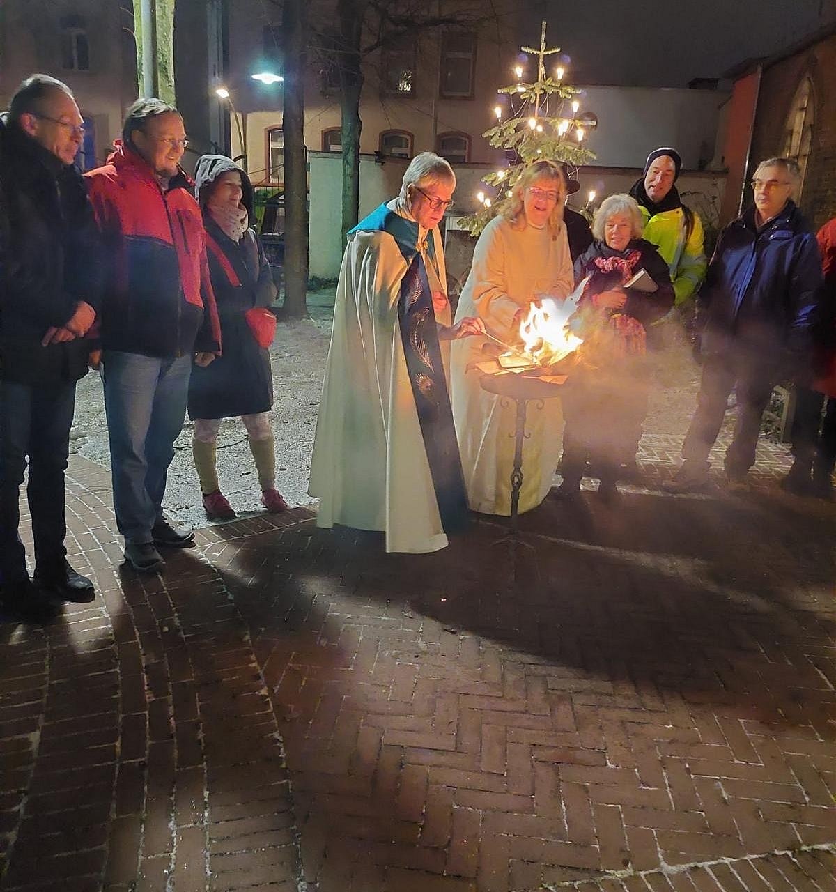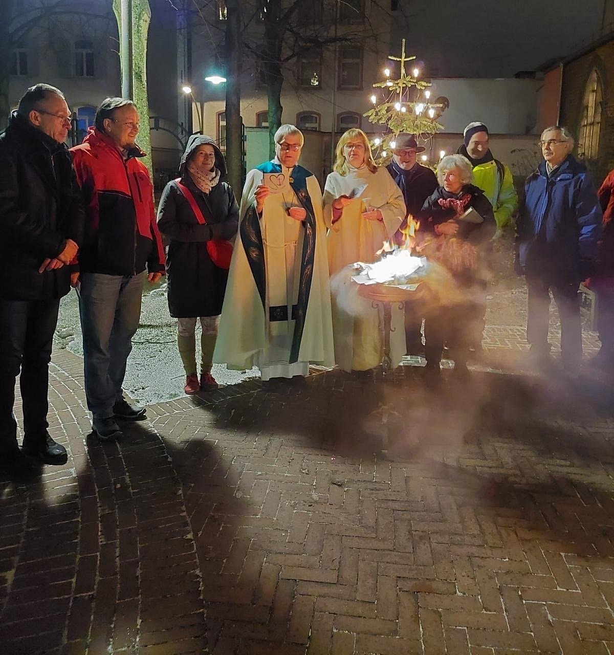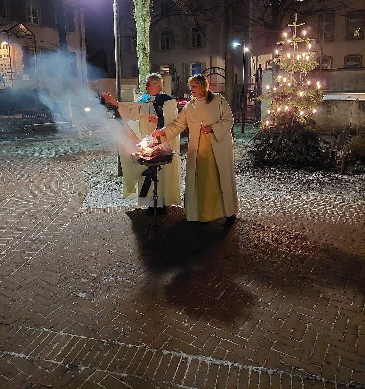 Zum Schluss der Vesper am 10. Januar wurden auf dem Josefsplatz die "Hoffnungskarten", aus dem gemeinsamen Pfingstmontagsgottesdienst der Pfarrei, verbrannt. Die Aktion des Pastoralteams, die im Frühjahr 2025 für die Pfarrei gestartet wurde, fand großen Anklang. Auf Postkarten wurden Fürbitten, Hoffnungen, Dank und Gebete formuliert. Diese Karten dienten am Pfngstmontag dem Pastoralteam als Predigt. Nun sind durch das Verbrennen der Karten alle Anliegen bei Gott (Psalm 141, 2 "Wie ein Rauchopfer steige mein Gebet zu dir auf")