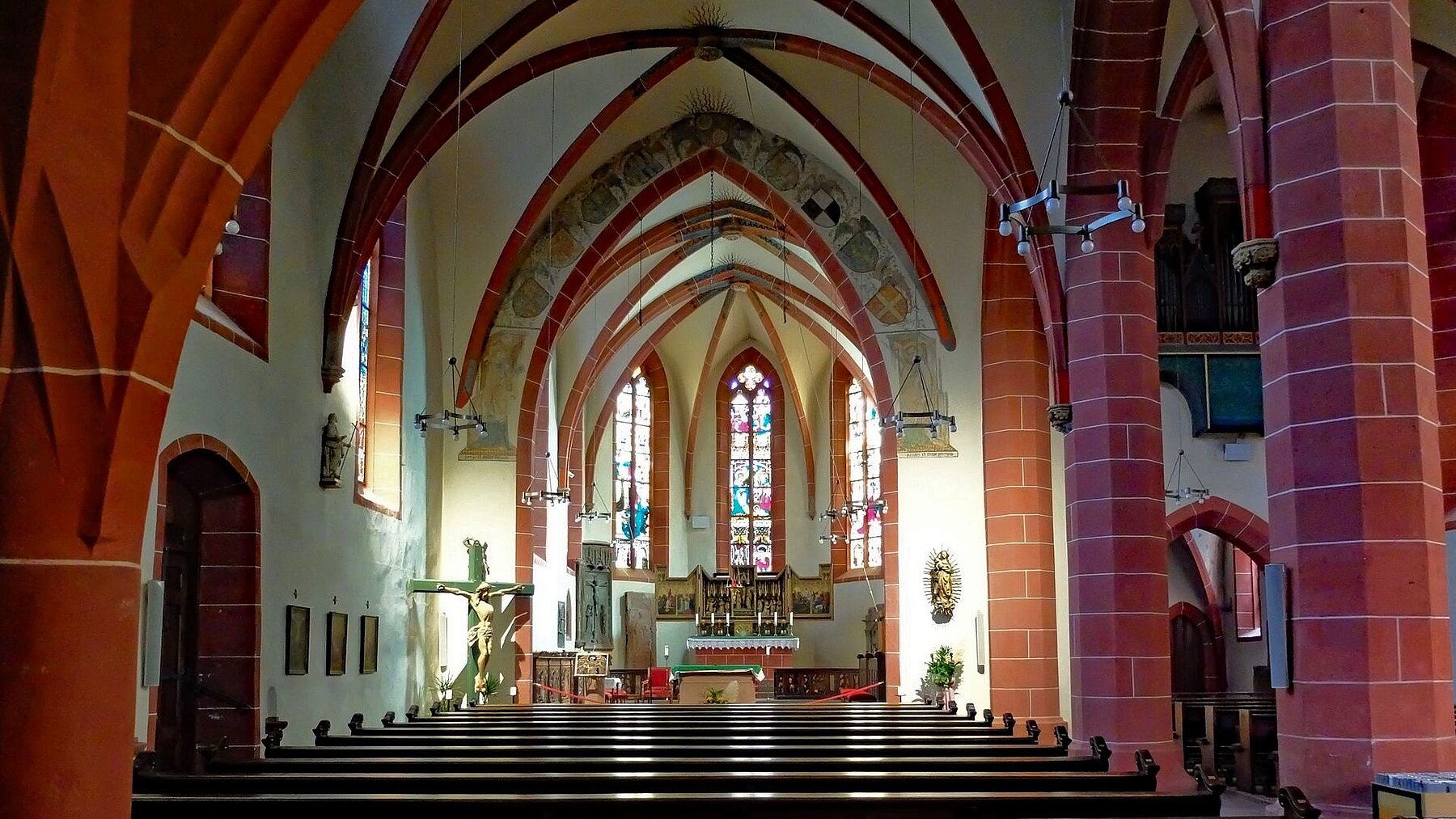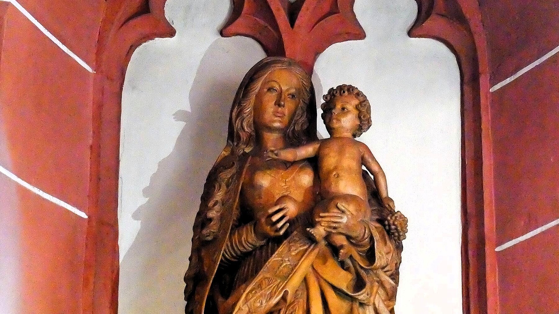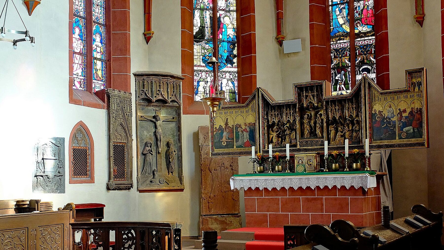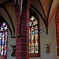 Höhepunkt der Fahrt war der Besuch der Pfarrkirche St. Peter und Paul; einer unsymmetrischen zweischiffigen Hallenkirche erbaut im gotischen Stil. Neben einer Reihe von Skulpturen, Decken- und Wandgemälden machte uns die Stadtführerin besonders auf eine anmutige Mondsichelmadonna aus Lindenholz aufmerksam; ein Werk des „Meisters mit dem Brustlatz“. So genannt weil sich seine weiblichen Heiligenstatuen mit einem zierenden Brustlatz über dem Dekollté auszeichnen. Bemerkenswert ist auch die Schauseite des Kirchturms. In seiner Formensprache verweist der Turm nach Frankfurt. Er wurde nämlich von einem Schüler des Frankfurter Dombaumeisters Madern Gerthener errichtet. In der Tat weist dieser Turm deutliche Ähnlichkeiten mit dem Turm unseres Domturms auf.