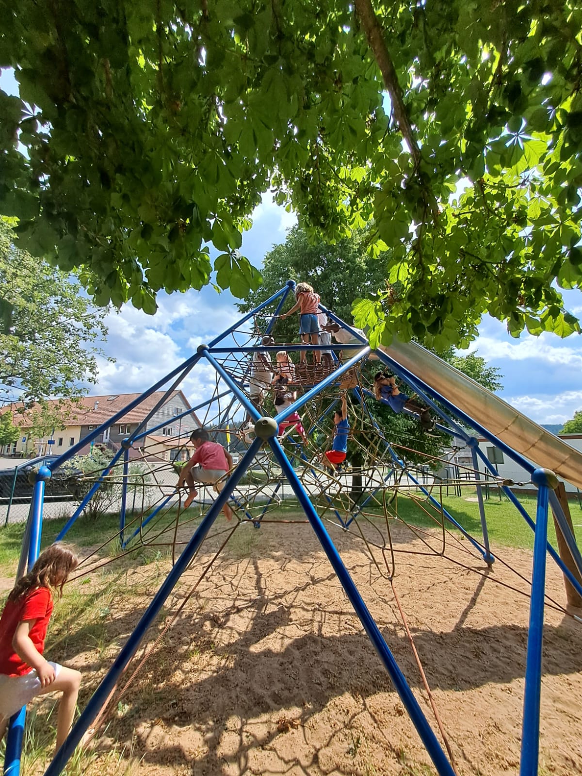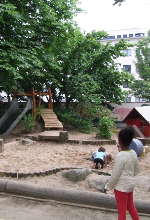 Sandburgen bauen, Schaukeln , klettern und Rutschen, all das können die Kinder im Hof. Die Plattenwege laden zum Fahren mit den Rädchen ein. In der heißen Sommerzeit bittet ein aufgestelltes Planschbecken die nötige Abwechslung.