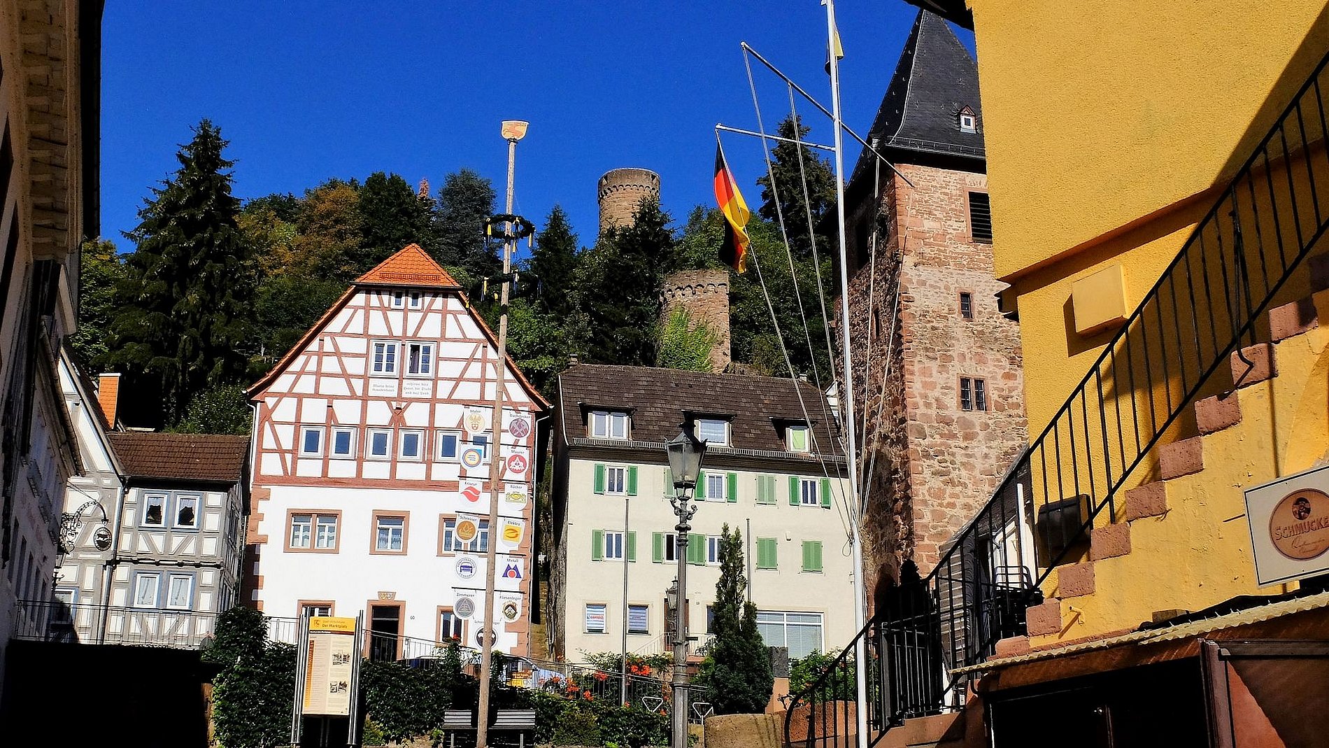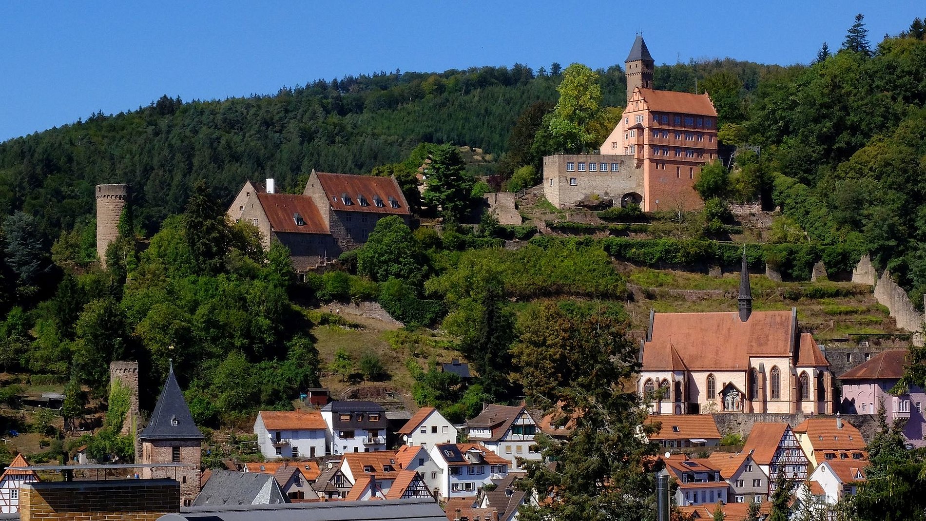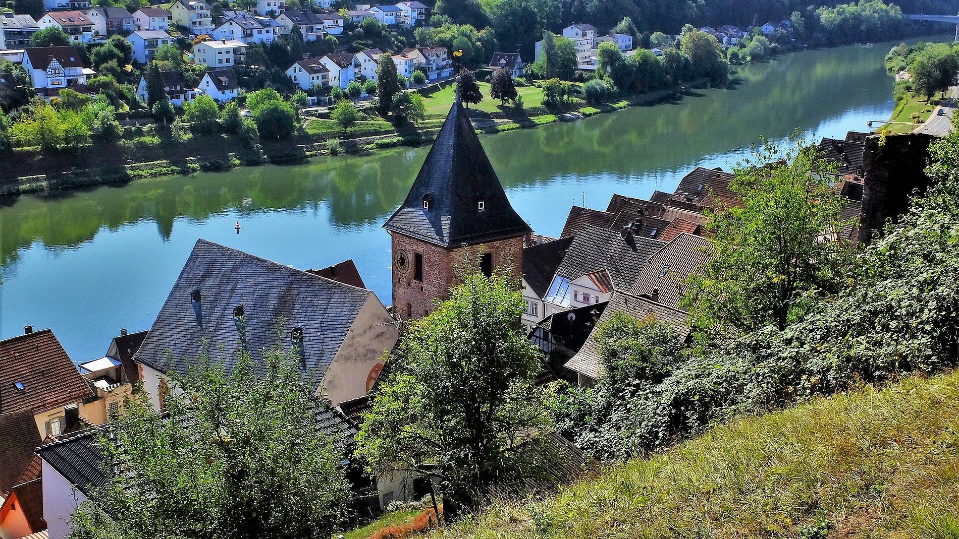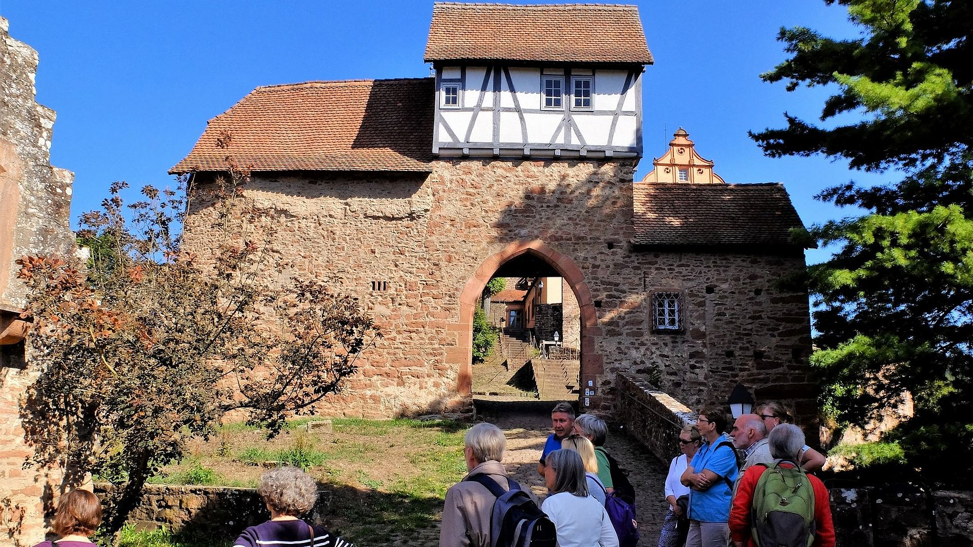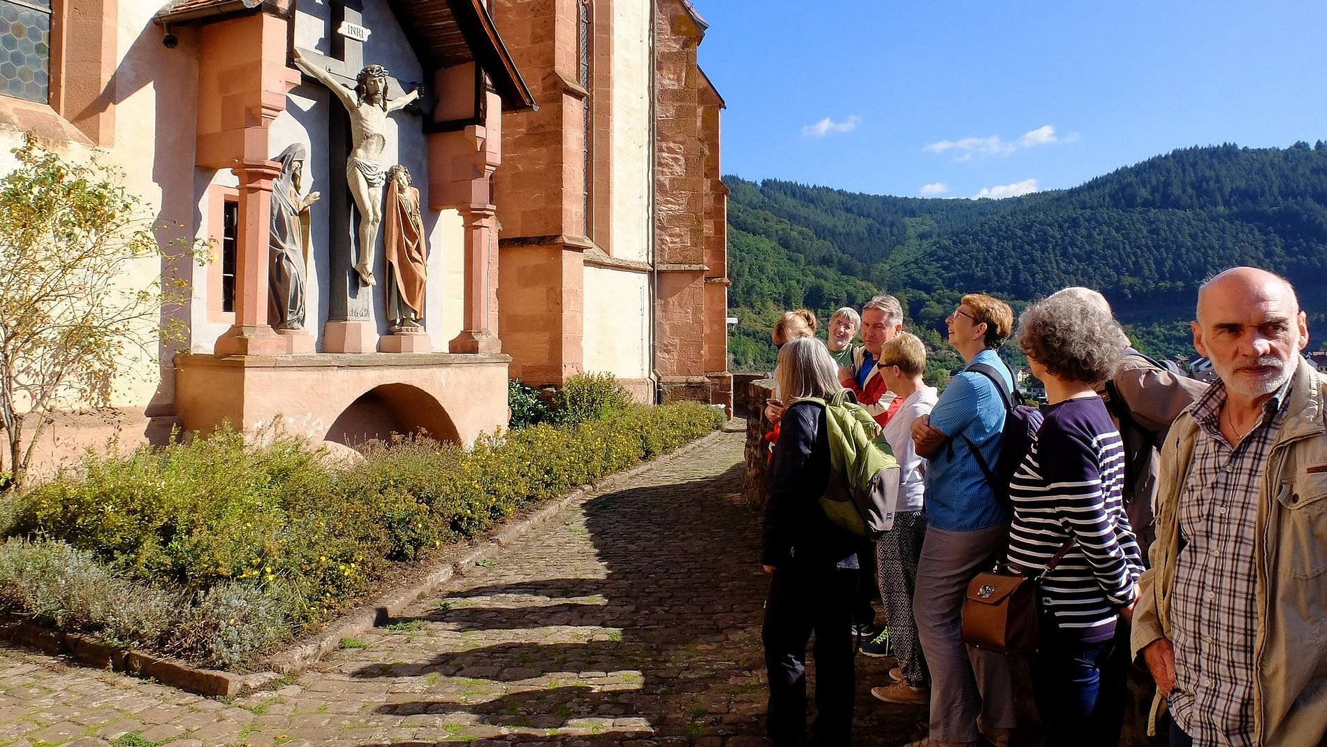 Dort war die Gruppe im Hotel „Zum weißen Lamm“ untergebracht. Von Kortelshütte aus wurde am Samstagvormittag zunächst das äußerst reizvolle Städtchen Hirschhorn am Neckar besichtigt. Der Stadtführer brachte der Gruppe zunächst die Besonderheiten der Stadt näher bevor es zur Karmeliter-Klosterkirche Mariä Verkündigung ging. Den Abschluss bildete die Burg Hirschhorn. Der Nachmittag war Neckarsteinach mit seinen vier Burgen gewidmet. Dem sonntäglichen Kirchgang in Eberbach am Neckar ging ein Bummel dort die dortige Altstadt voraus. Bevor es wieder Richtung Heimat ging, stand noch der Besuch des Katzenbuckels auf dem Programm. Der Katzenbuckel ist der höchste Berg des gesamten Odenwaldes. Den Abschluss bildete ein gemütliches und schmackhaftes Mittagessen in der Brauergaststätte einer bekannten Odenwälder Brauerei.