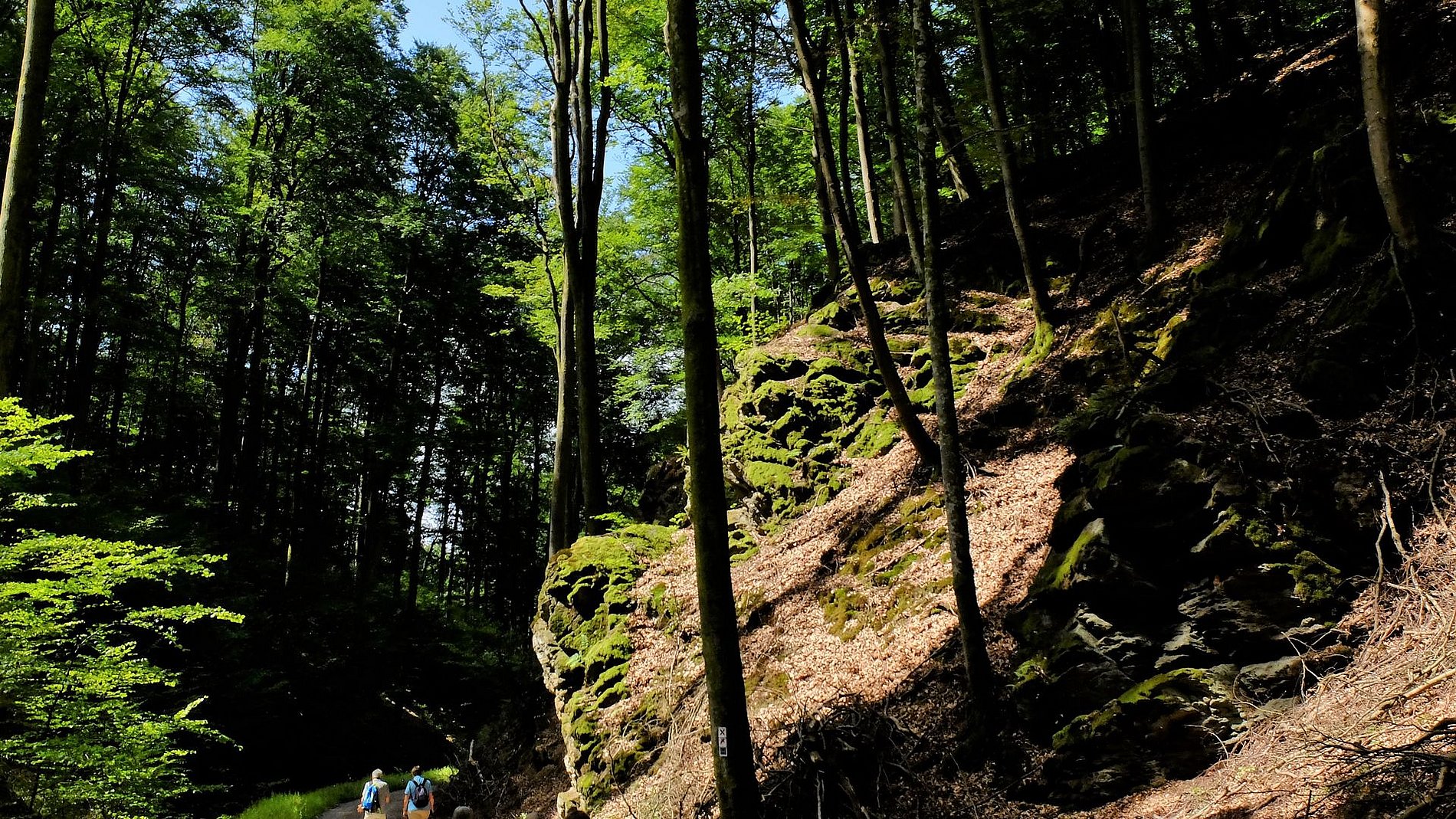 Vom Treffpunkt in Alzenau-Hörstein aus ging es auf eine waldreiche Wanderung. Nach einstündigem gemäßigen Bergan erreichten die Wanderer den Ort Rückersbach, wo unter freiem Himmel Mittagsrast eingelegt wurde. Von dort war es nicht mehr weit bis zum Höhepunkt der Wanderung – der Rückersbacher Schlucht. Die Wände der schattigen Schlucht ragen fast senkrecht empor. Die Felsen treten nahe an den Weg heran. Ein idealer Ort für heiße Tage. Nach der Schlucht erwartete die Wandergruppe ein Mix aus sonniger Feldlandschaft und nochmals schattigem Wald. Zufrieden wurde der Heimweg nach Frankfurt angetreten.