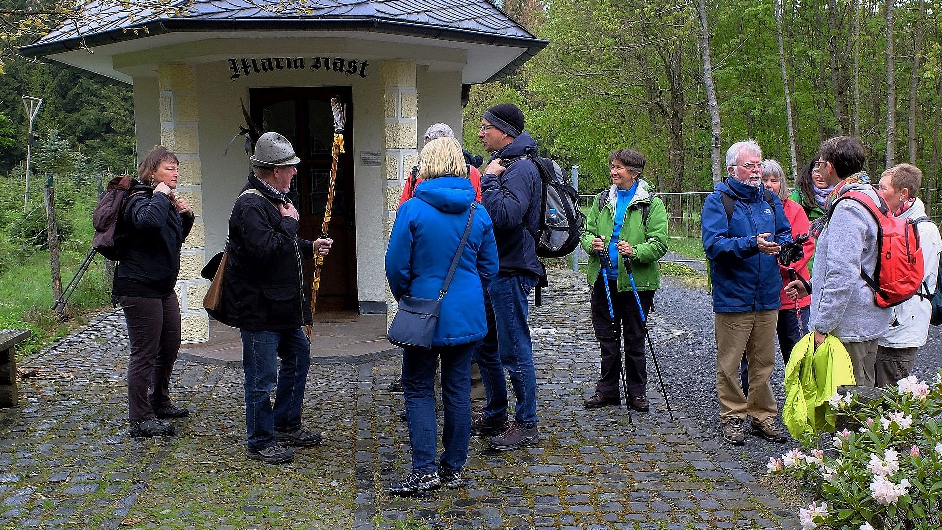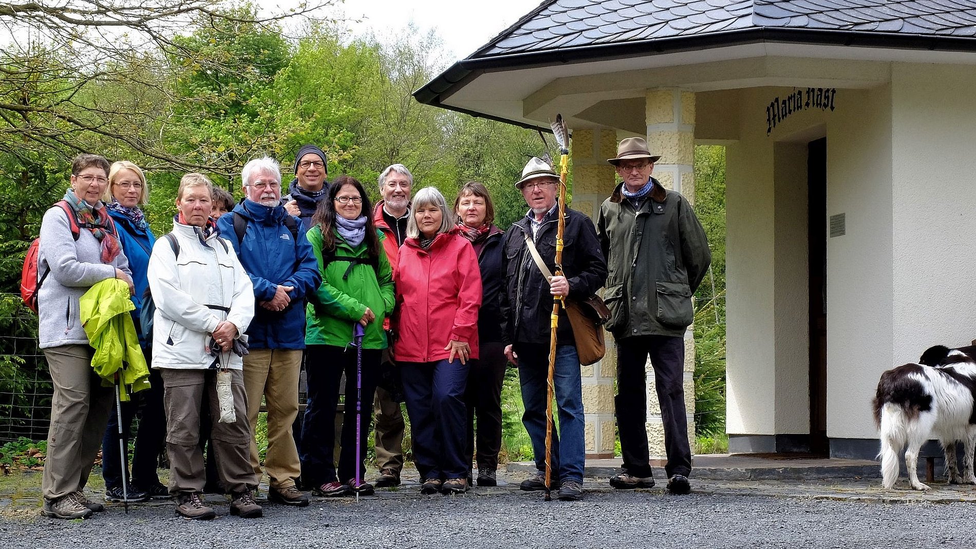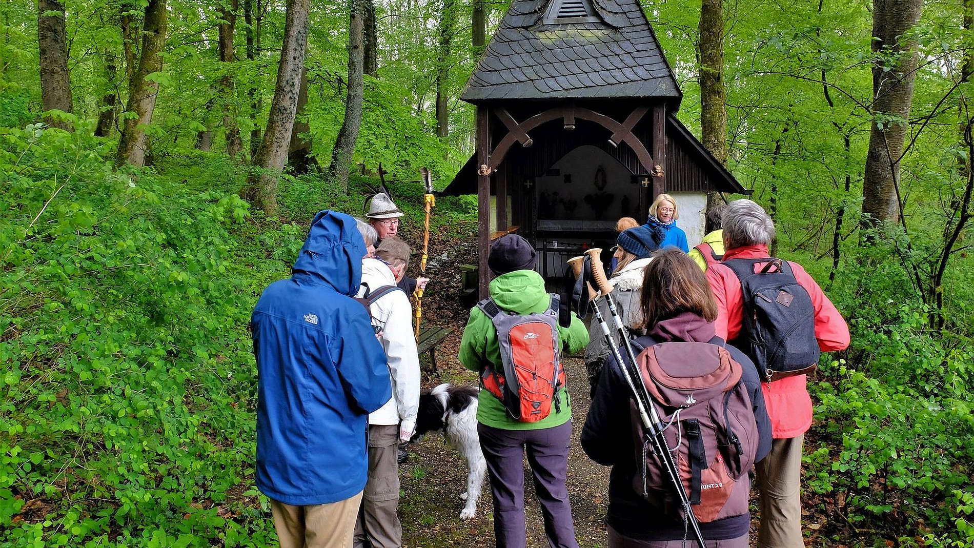 Als die Wandergruppe von Sankt Josef am 5. Mai ihre Wanderung im Westerwald startete, zeigte sich der Wonnemonat überhaupt nicht wonnig. Und dennoch hatten die Wanderer an diesem Tag das Glück, die Strecke von 17 km ohne nennenswerte Niederschläge zu schaffen. Auf dem Programm stand eine „Kapellen- und Bildstockwanderung“, die Einblicke in die Vielfalt der religiösen Volkskunst gab. Den Schluss der Wanderung bildete ein Besuch der Rotenhainer Motte „Alte Burg“ bei gemütlichem „Kaffee und Kuchen“ nach Westerwälder Art. Zur Erklärung: Motten waren kleine mittelalterliche Turmhügel- oder Erdhügelburgen; häufig Sitze des Kleinadels. Die meisten Motten dürften untergegangen sein. In Rotenhain im Westerwald wurde von Generation zu Generation weitergegeben, das da irgend etwas wie eine Burg im Wald gewesen sein muss; schließlich heißt ein entsprechendes Flurstück „Alte Burg“. Und tatsächlich: Bei Wegearbeiten stieß man vor einigen Jahren auf die Grundmauern und einen alten Brunnen einer Motte. Wie diese Motten im Mittelaltern aussahen, kann nur vermuten werden. Es gibt nämlich nur sehr wenige Bildzeugnisse. So bauten Ehrenamtliche auf den lange verschollenen Grundmauern einer Motte die „Alte Burg“ auf und zwar so, wie es sich das anhand der wenigen Quellen vermuten lässt. Die Wandergruppe läuft also nicht „nur“ durch Wald und Feld, sondern zeigt sich auch interessiert an den geschichtlichen und kulturellen Hintergründen des jeweiligen Wandergebiets.