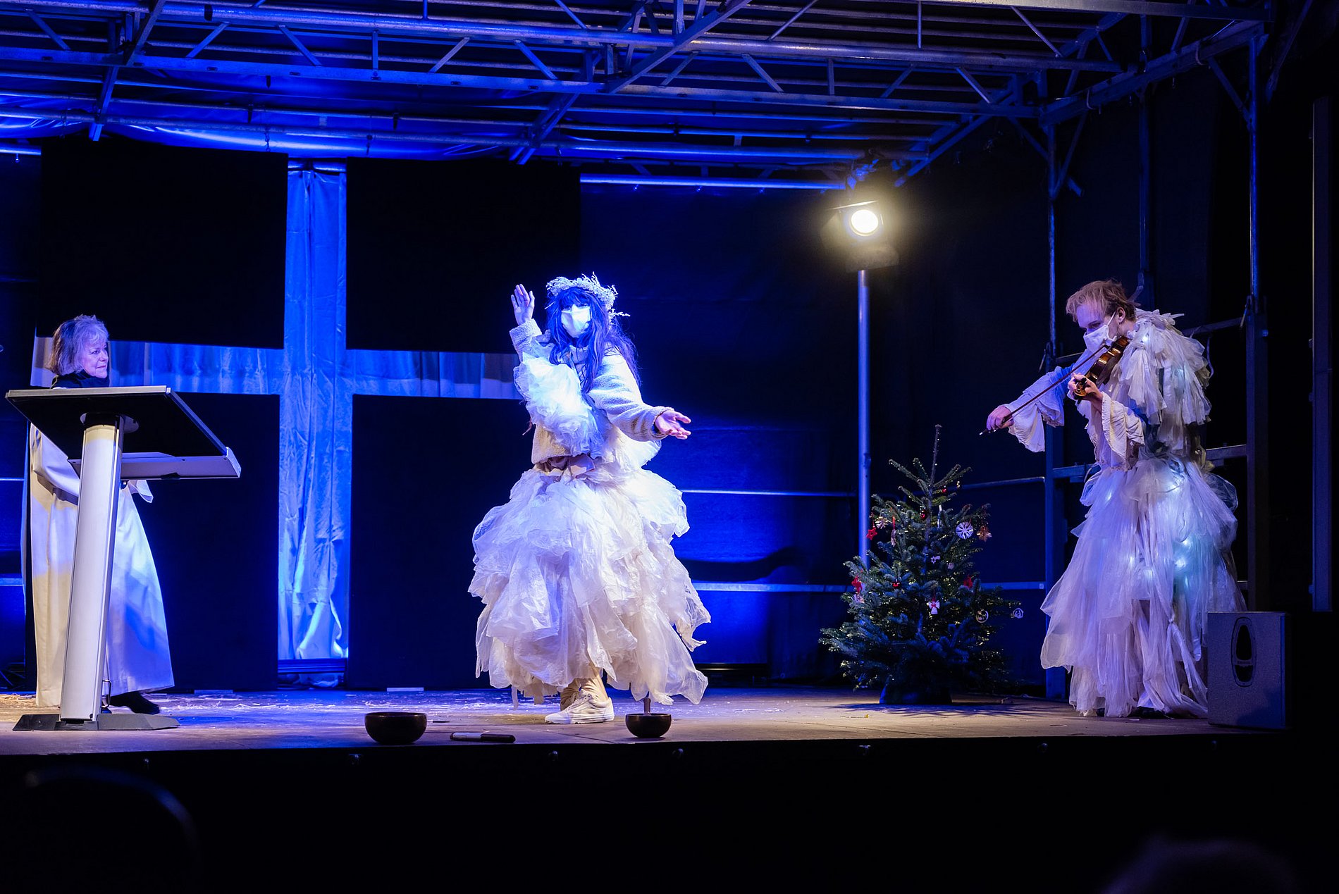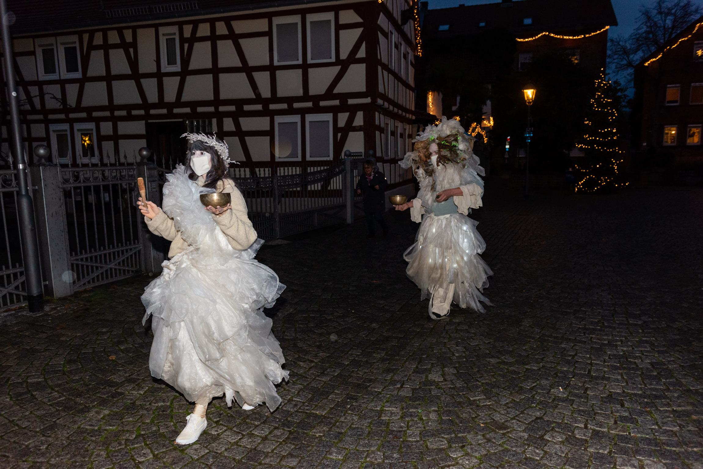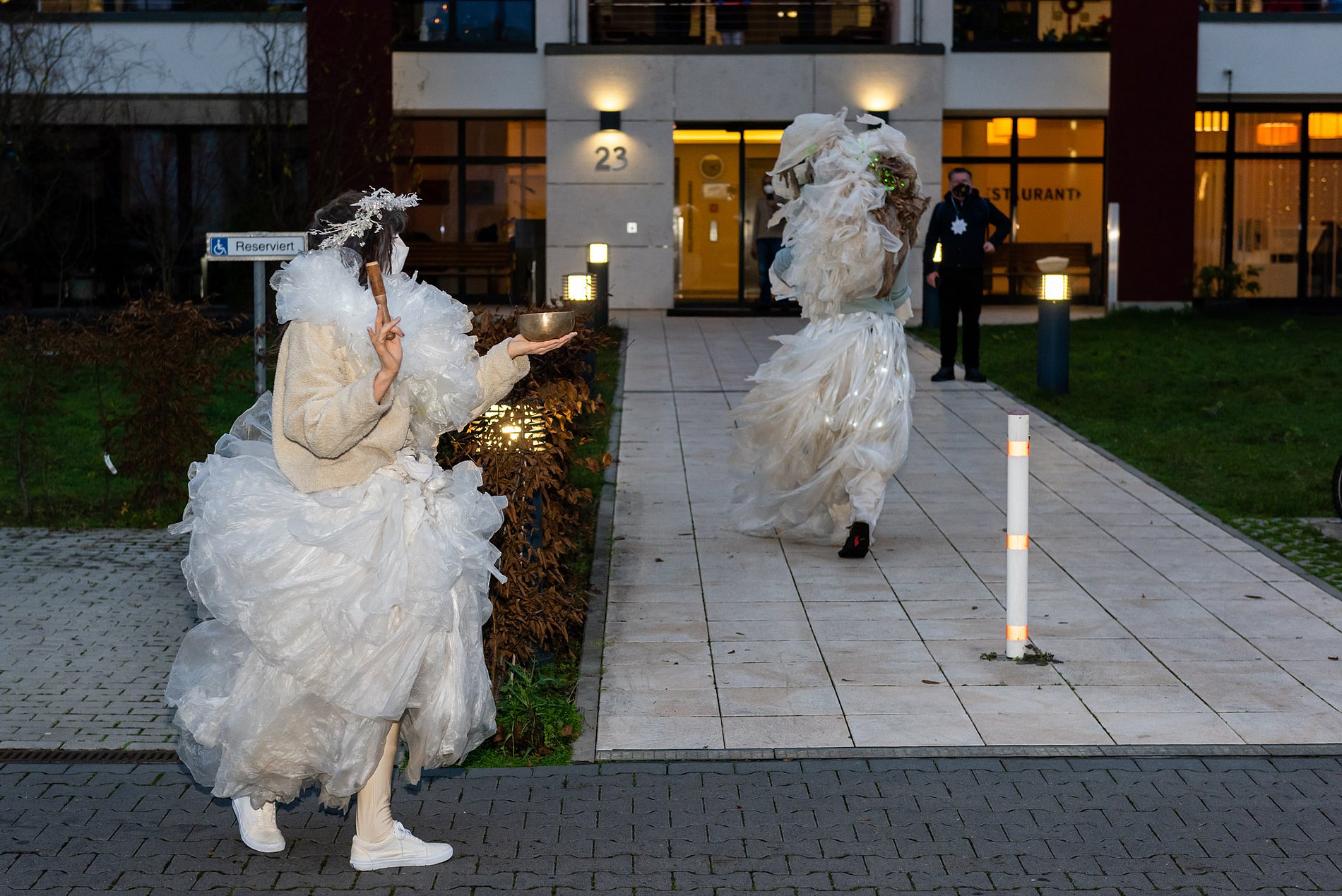Zu vor gab es einen Moment der Überraschung und des Staunens für die Bewohner*innen des Heinrich-Schleich-Hauses und eines Behindertenwohnheims: Zwei Ensemblemitglieder des Antagontheaters waren zusammen mit Pastoralreferentin Gabriela von Melle in Lichtkostümen unterwegs – waren da Engel? Lichtgestalten? Freudenboten? – überraschende Begegnungen!