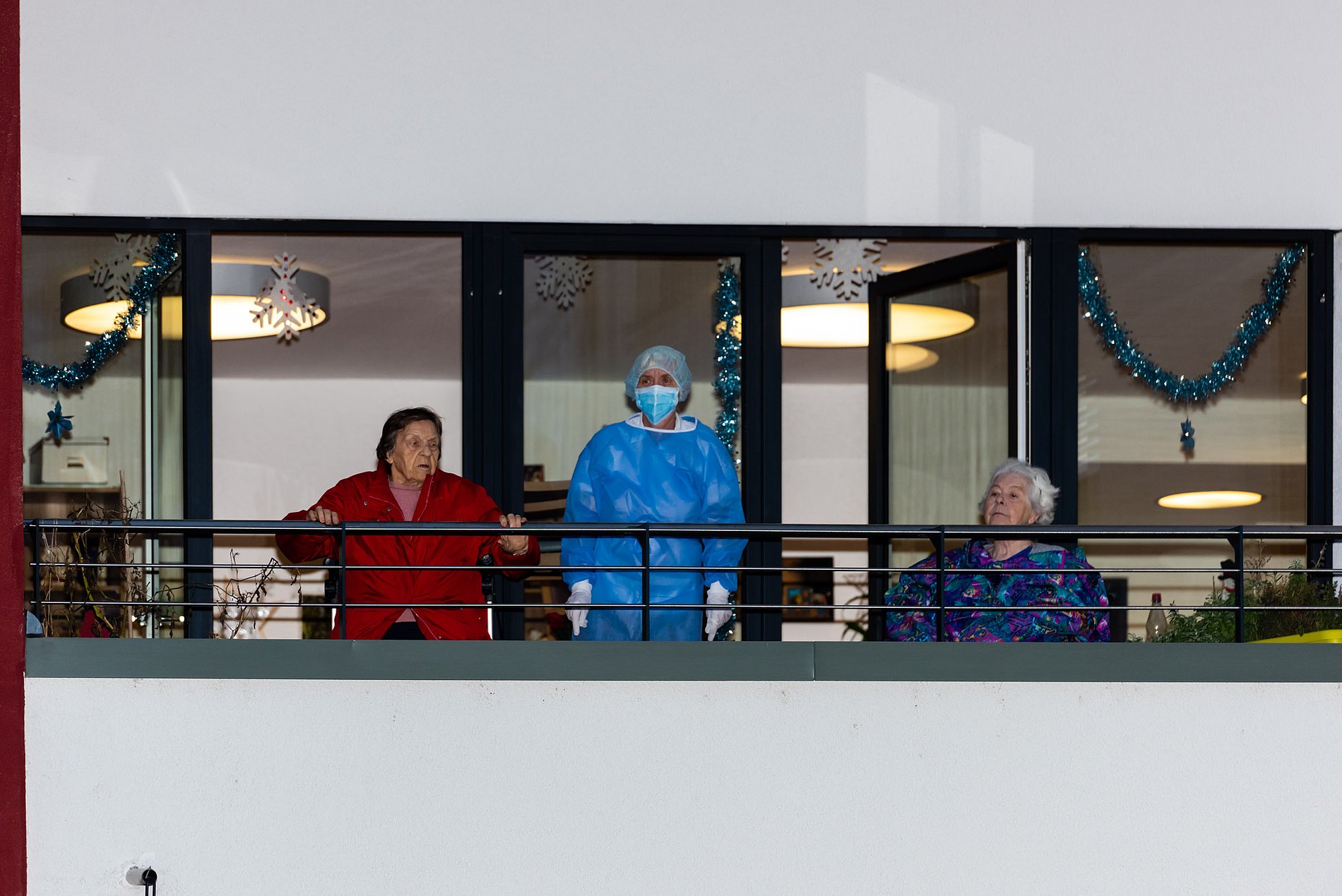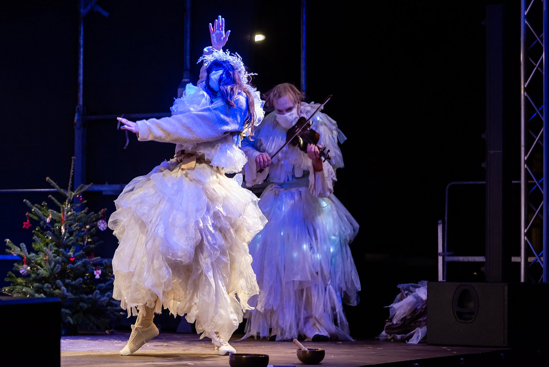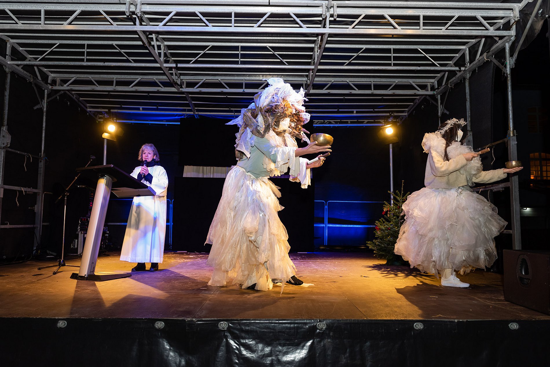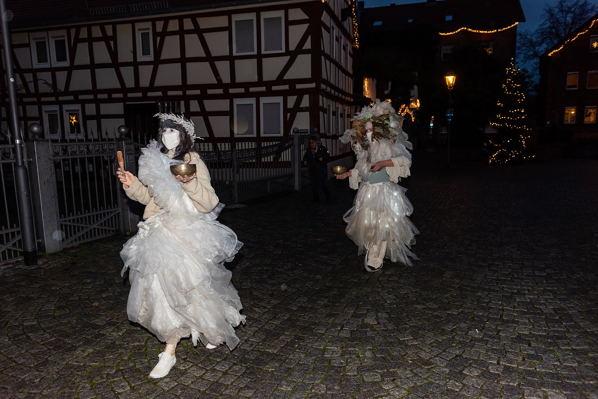 Zu vor gab es einen Moment der Überraschung und des Staunens für die Bewohner*innen des Heinrich-Schleich-Hauses und eines Behindertenwohnheims: Zwei Ensemblemitglieder des Antagontheaters waren zusammen mit Pastoralreferentin Gabriela von Melle in Lichtkostümen unterwegs – waren da Engel? Lichtgestalten? Freudenboten? – überraschende Begegnungen!
