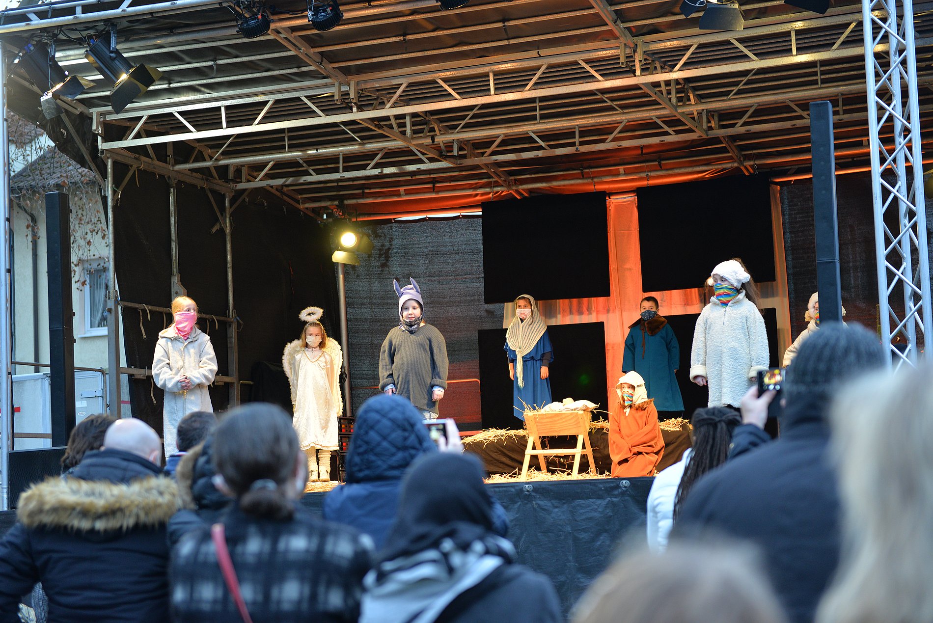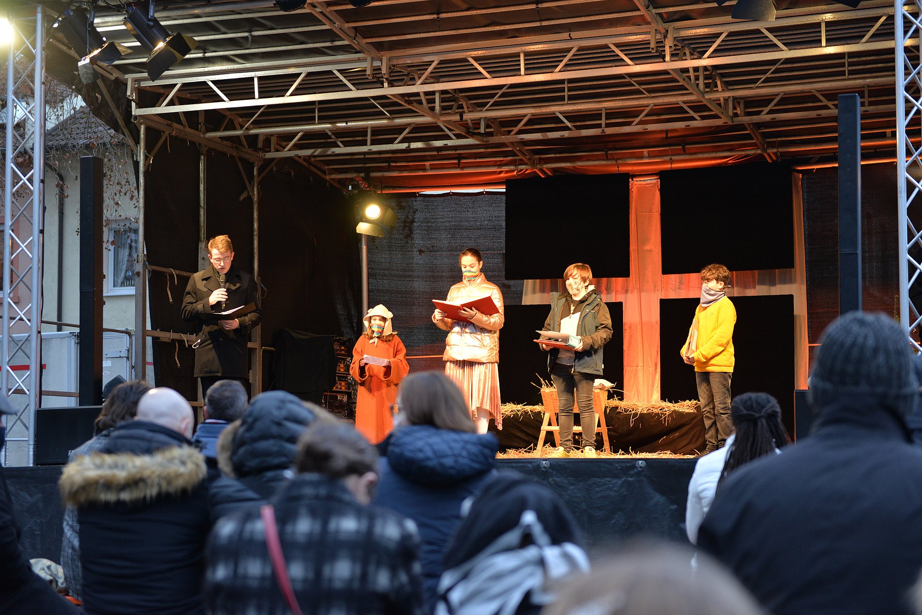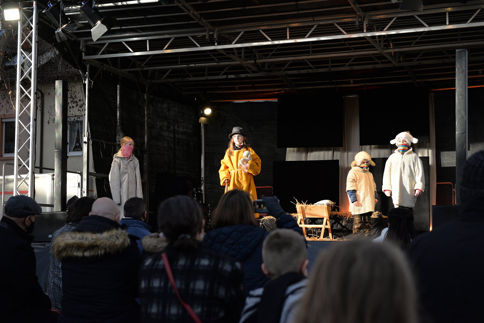 Es war ein besonderer Heiliger Abend, ganz anders als sonst. Ungewöhnlich, mit Einschränkungen und Herausforderungen. Umso schöner, dass wir an diesem Tag zur Krippenfeier zusammenkommen konnten. Etwa 100 Personen kamen um 15 Uhr in den Kirchgarten von Herz Jesu, wo dank des Arbeitskreises Fechenheimer Vereine e.V. eine Bühne samt Technik, Bänke und Zelte aufgestellt wurden.