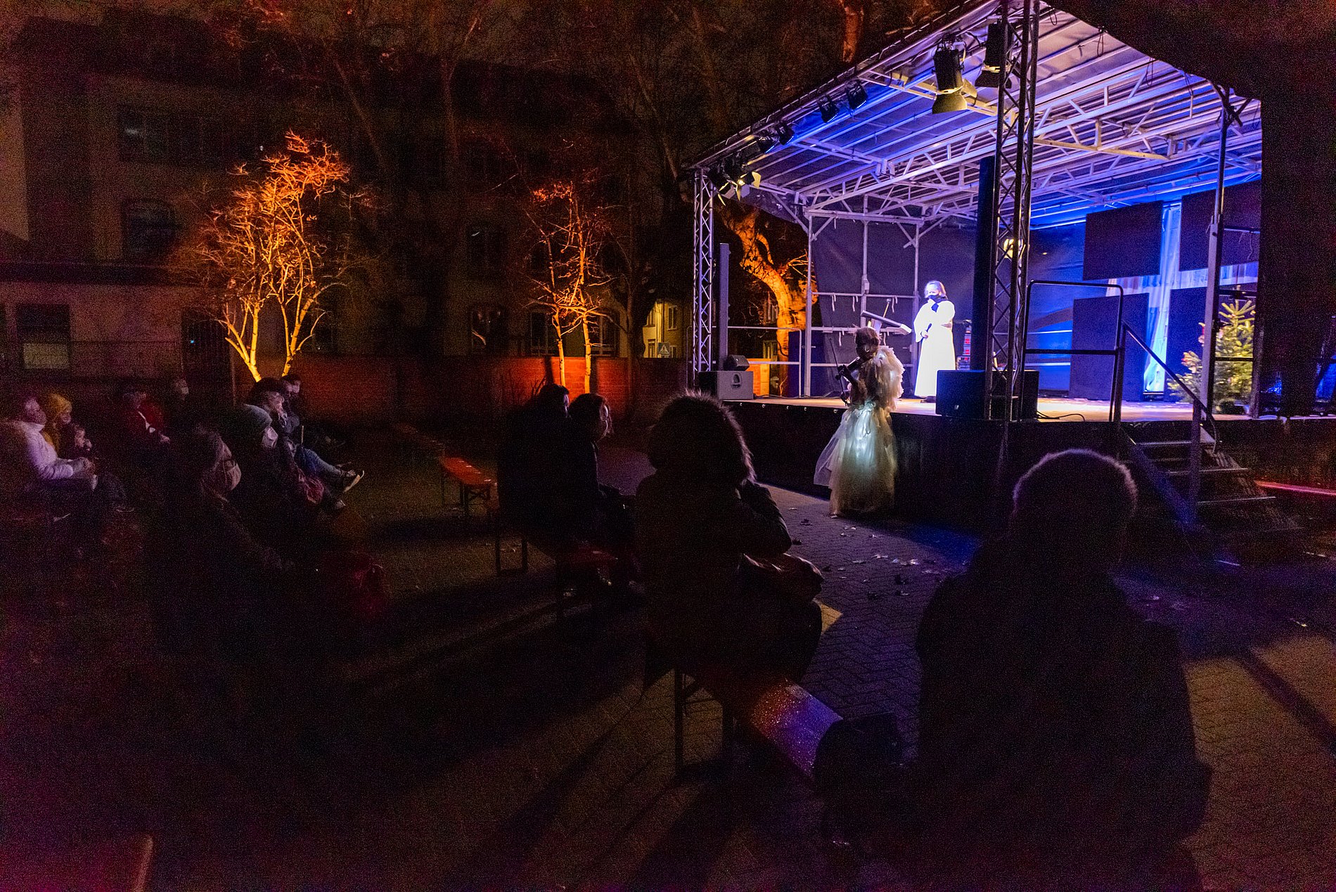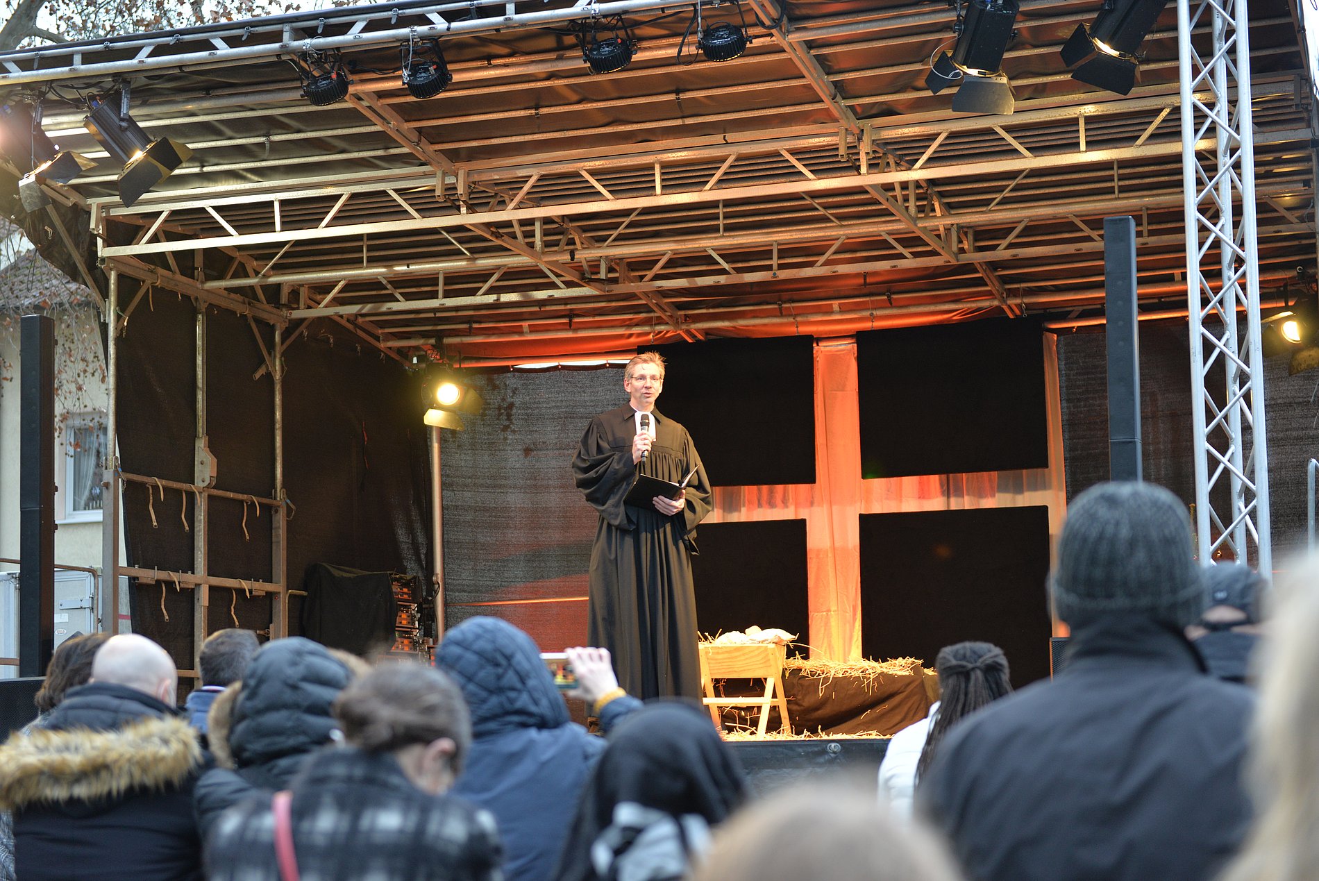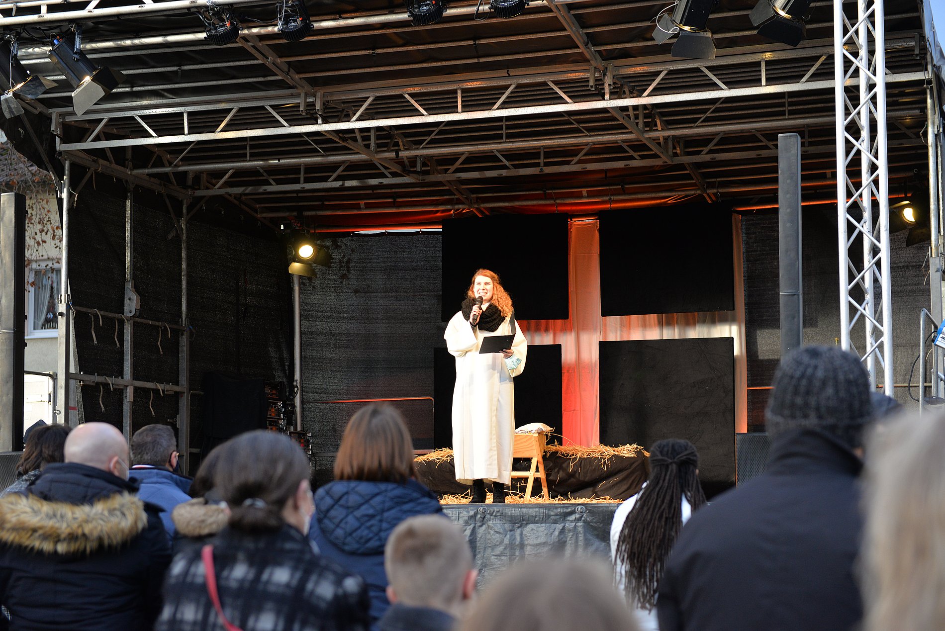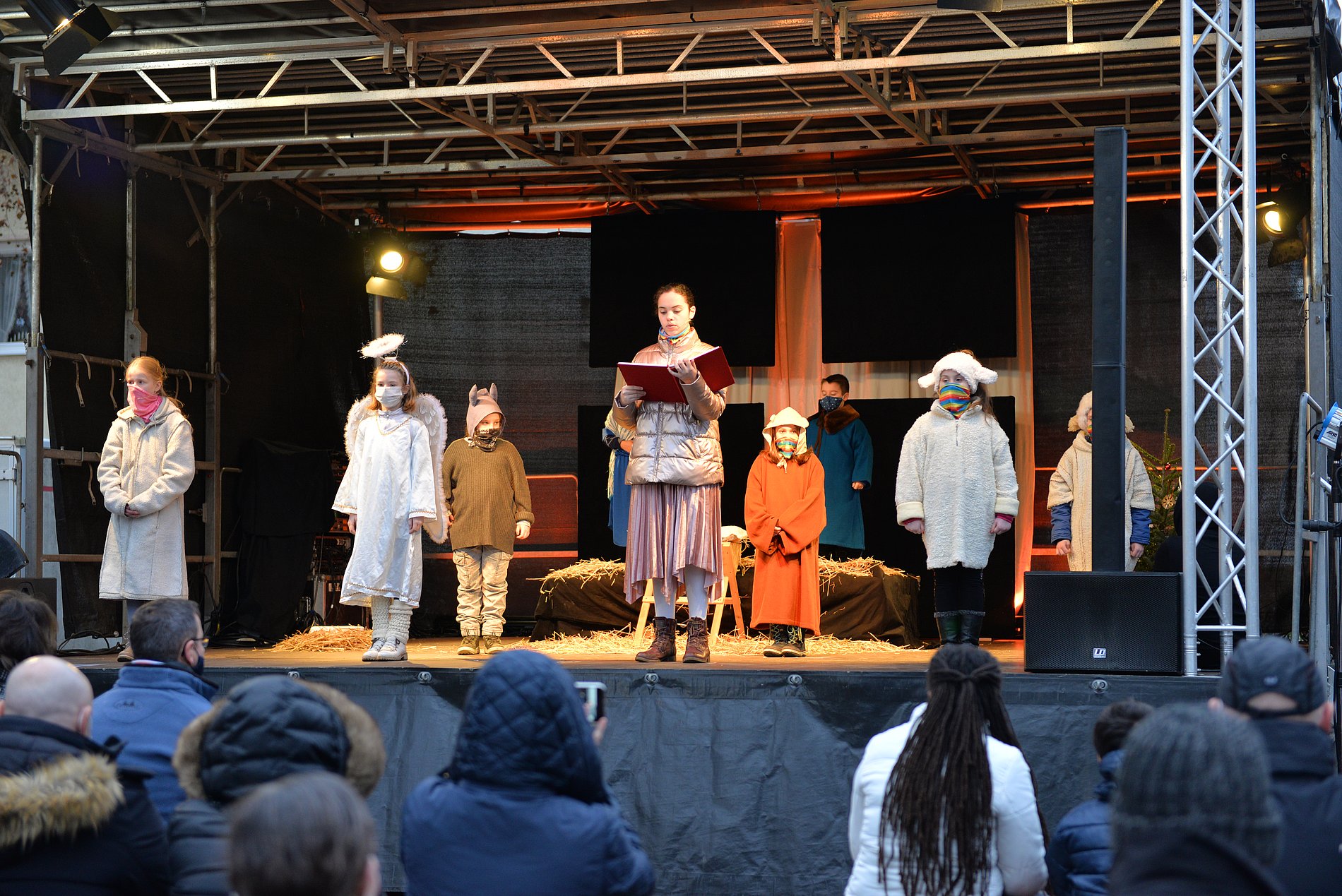 Es war ein besonderer Heiliger Abend, ganz anders als sonst. Ungewöhnlich, mit Einschränkungen und Herausforderungen. Umso schöner, dass wir an diesem Tag zur Krippenfeier zusammenkommen konnten. Etwa 100 Personen kamen um 15 Uhr in den Kirchgarten von Herz Jesu, wo dank des Arbeitskreises Fechenheimer Vereine e.V. eine Bühne samt Technik, Bänke und Zelte aufgestellt wurden.