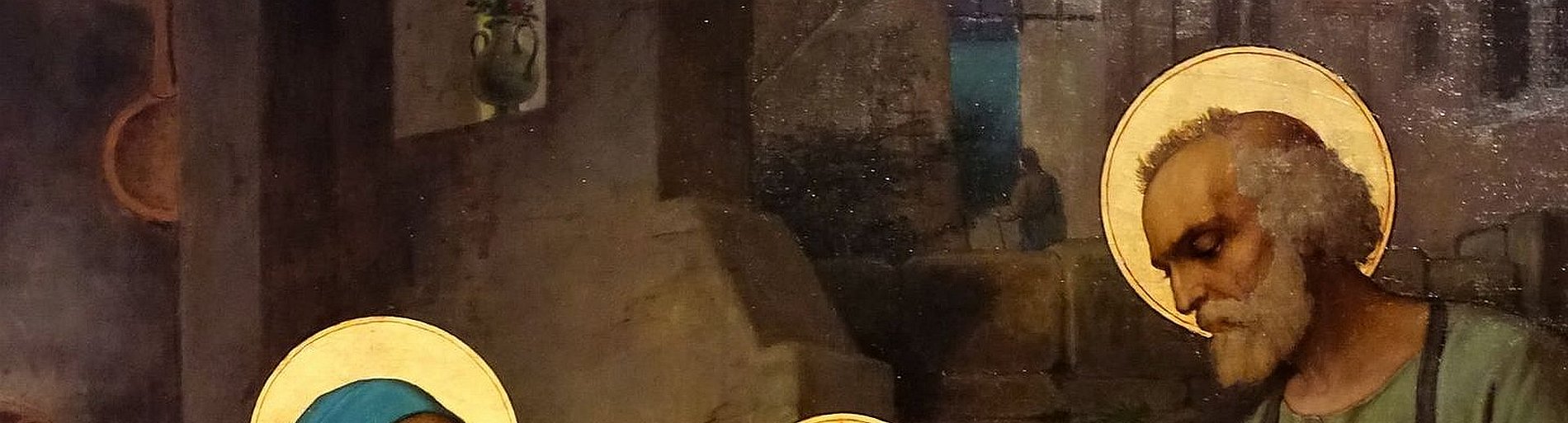 Für viele Gemeindemitglieder ist das Tafelbild der Heiligen Familie völlig unbekannt, ist es doch seit der Eröffnung der Neuen Josefskirche in der Sakristei über dem Ankleidetisch zu finden. Nach erfolgter Restaurierung durch die Frankfurter Diplom-Restauratorin Maike Behrends war es pünktlich zum Fest der Heiligen Familie 2020 in der Josefskirche zurück und wurde der Gemeinde rechts des großen Chorbogens für 2 Wochen präsentiert. Inzwischen ist es wieder auf seinem PLatz in der Sakristei zurück. Die Restaurierung konnte aus noch vorhandenen Erlösen vergangener Flohmärkte finanziert werden.