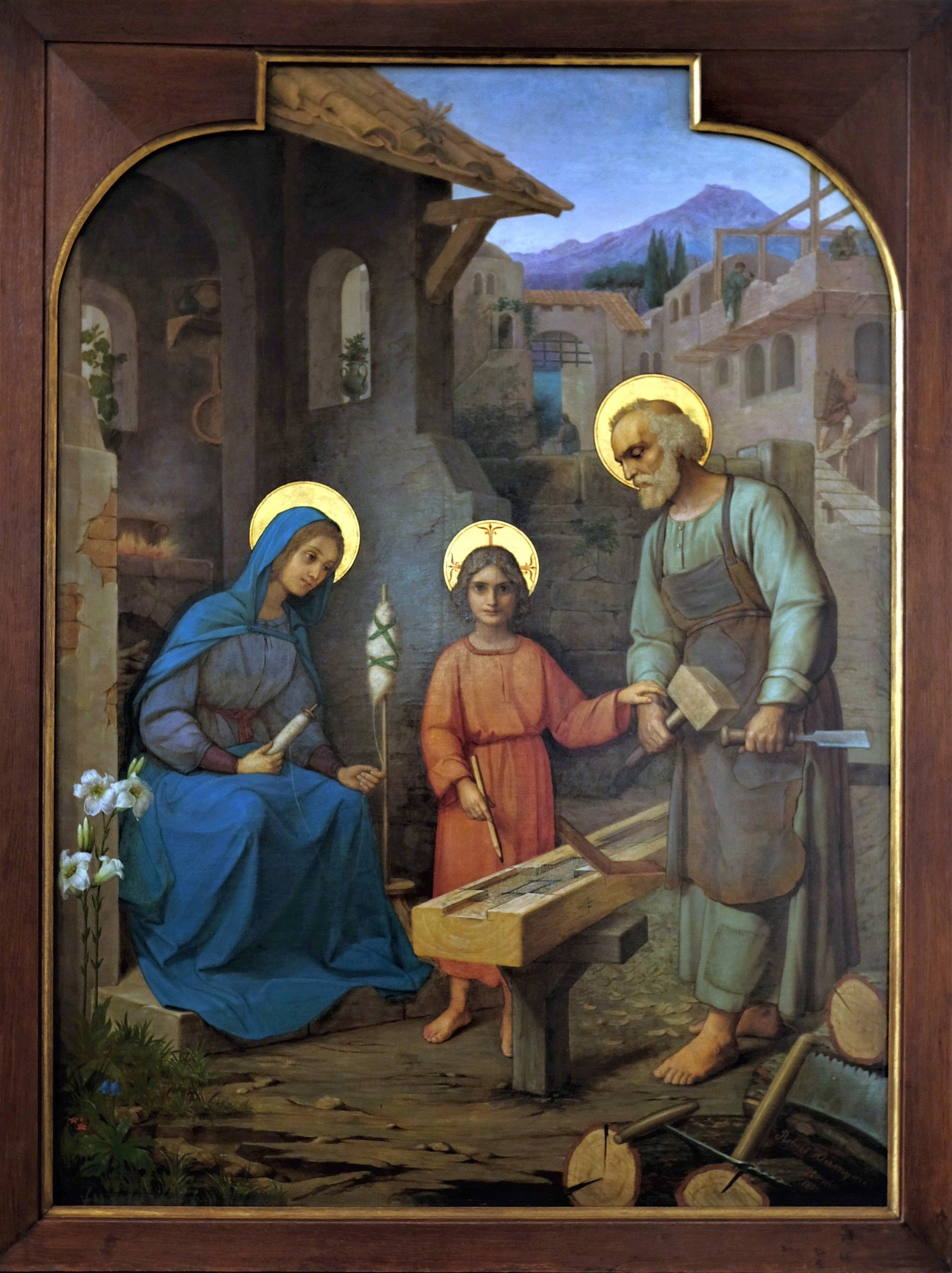 Maria, die allerseligste Gottesmutter, bietet das Bild einer anmutigen, fleißigen und frommen Hausfrau. Während sie spinnt und kocht, ist ihr Blick auf ihren göttlichen Sohn gerichtet, und sie lauscht seinen Worten und Belehrungen, die er mit der Arbeit verbindet. Die Lilien zur Seite deuten auf die Unschuld der einzelnen heiligen Personen, wie auch auf das reine gottgeweihte Familienleben. Im Hintergrund des Bildes erblicken wir einen Bau, für den St. Joseph das Holz zurichtet. An einem Balken ist noch der letzte Teil der Arbeit (eine sogenannte Fußschwelle) nach einer Zeichnung des Herrn zu vollenden. Die Landschaft ist aus der Umgebung Roms genommen.