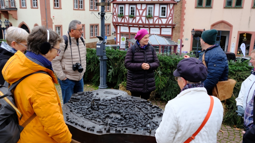 Am Modell der mittelalterlichen Stadt empfing uns der Stadtführer. Dort tauchten wir tief in der Geschichte der alten Reichsstadt Gelnhausen ein – beginnend mit Gründung durch Kaiser Friedrich I; auch als Barbarossa bekannt. Im Laufe der Führung erfuhren mehr über den Kampf der Bürger mit dem Orden der Prämonstratenser um eine zweite Kirche in der Stadt.
