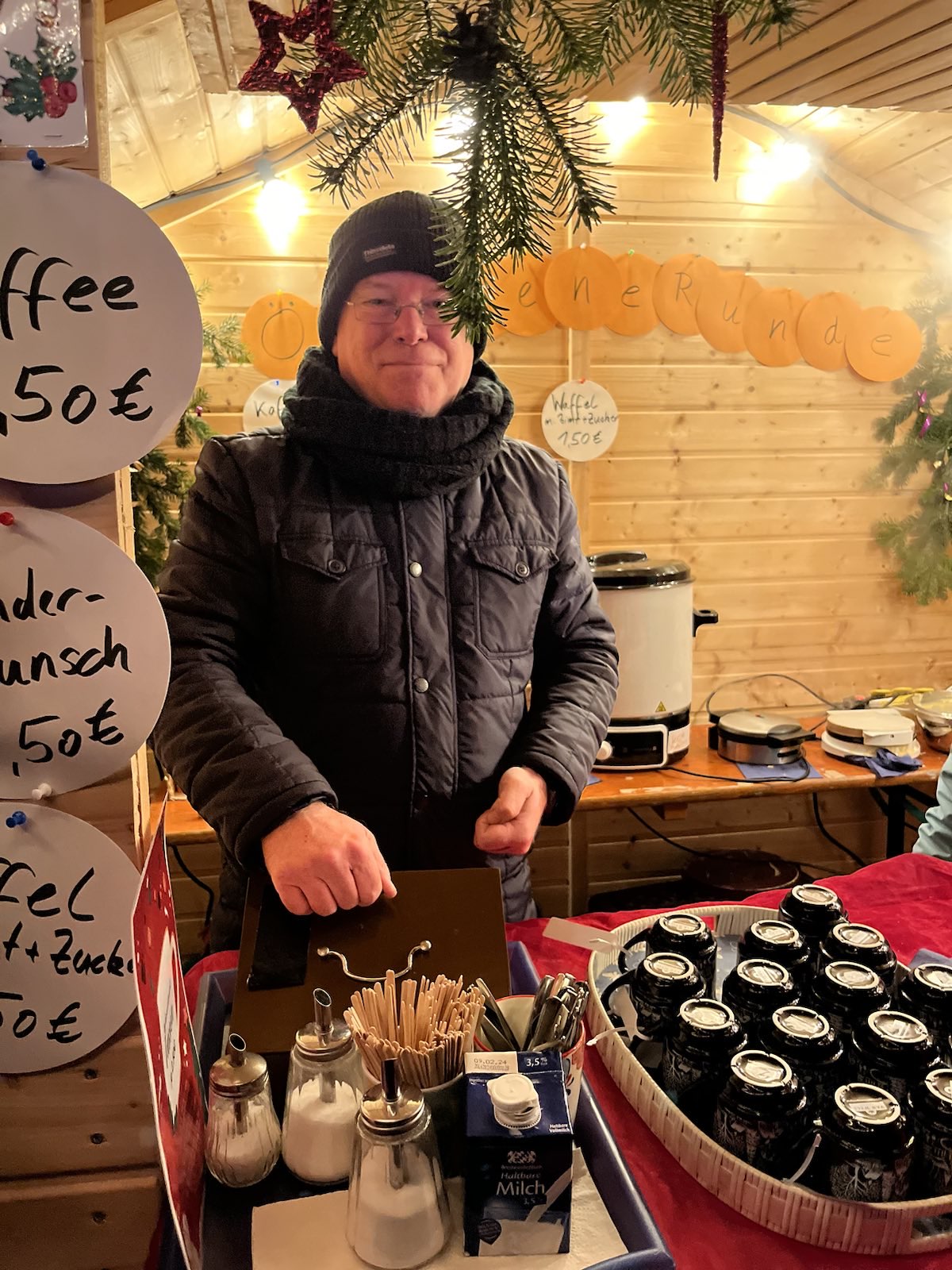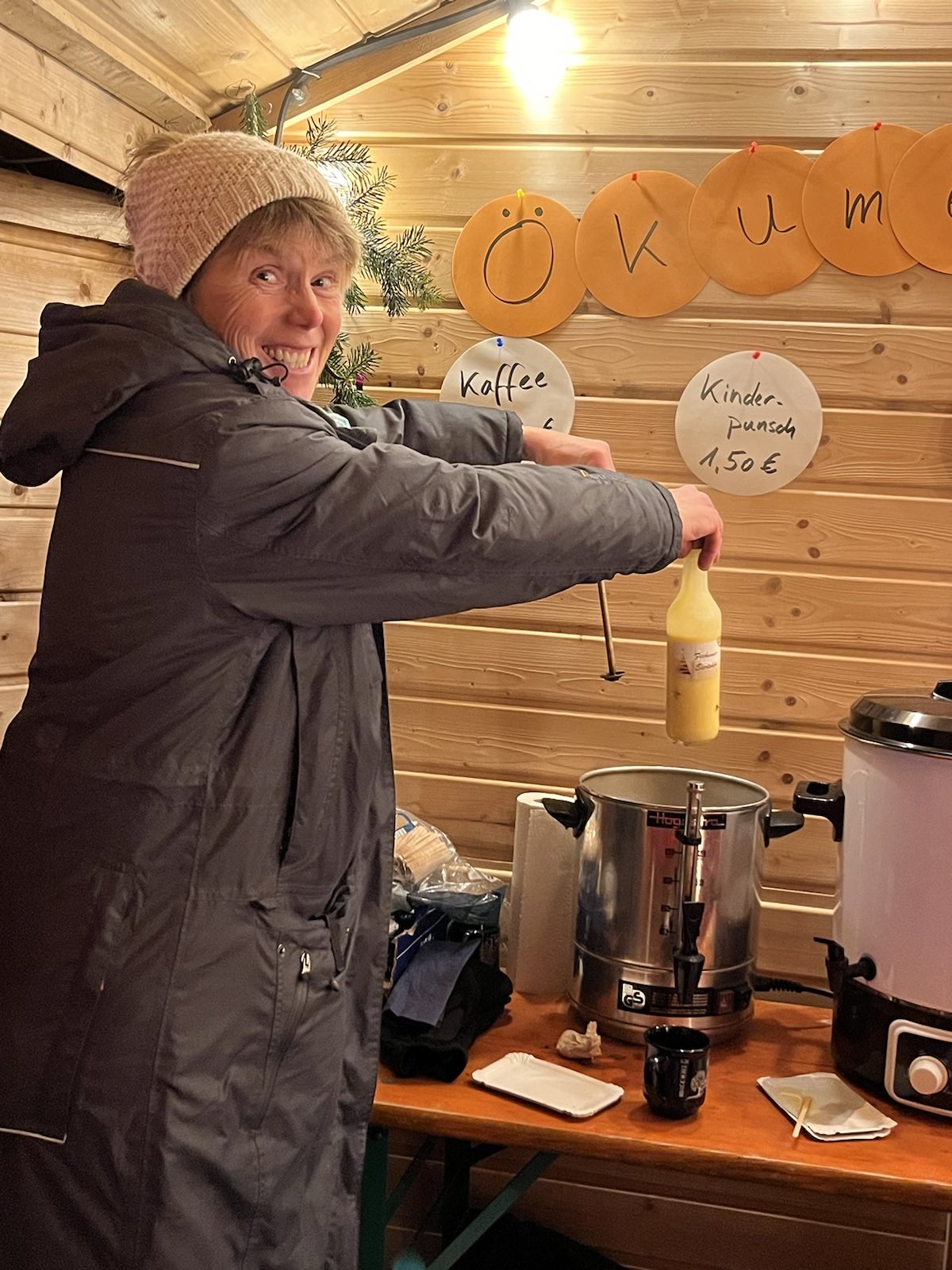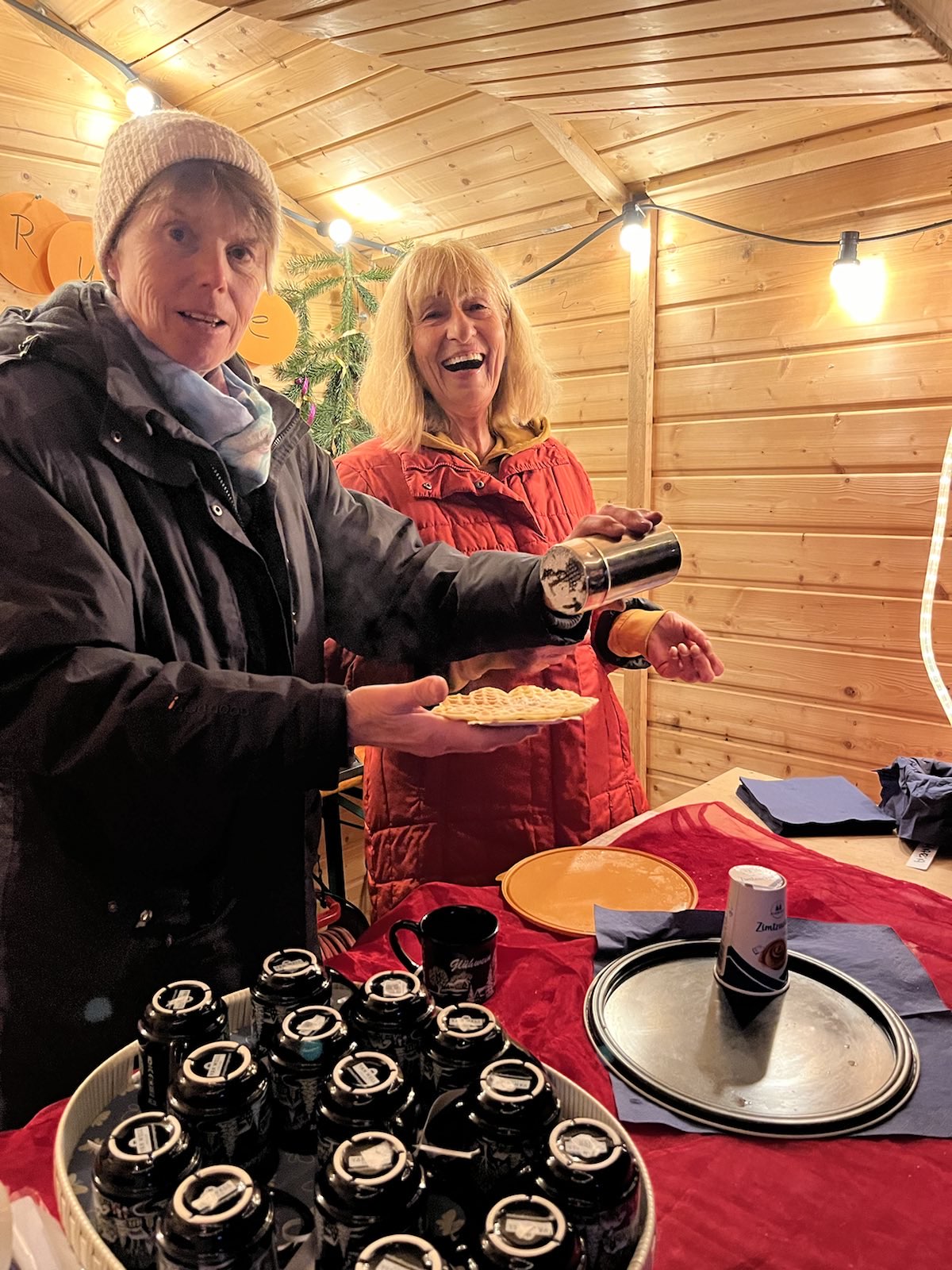 So hat die Ökumenegruppe einen Waffelstand mit Kaffee und Kinderpunsch auf dem Schulhof der alten Freiligrathschule eröffnet: Der guten Laune tat auch der Regen am Samstag keinen Abbruch. Über den ganzen Platz verbreitete sich der Duft der Waffeln und viele konnten nicht widerstehen. Es machte allen richtig viel Spaß.