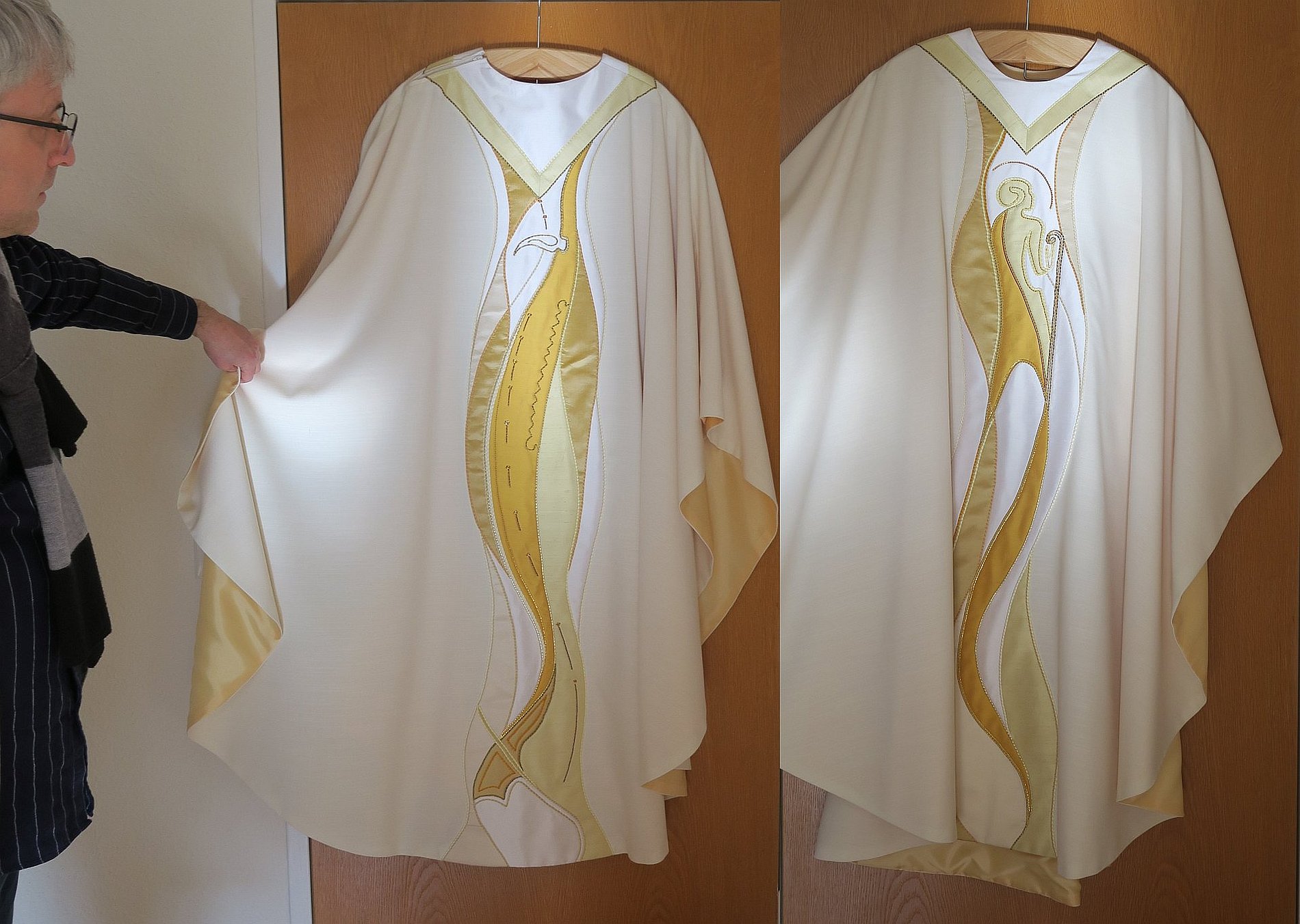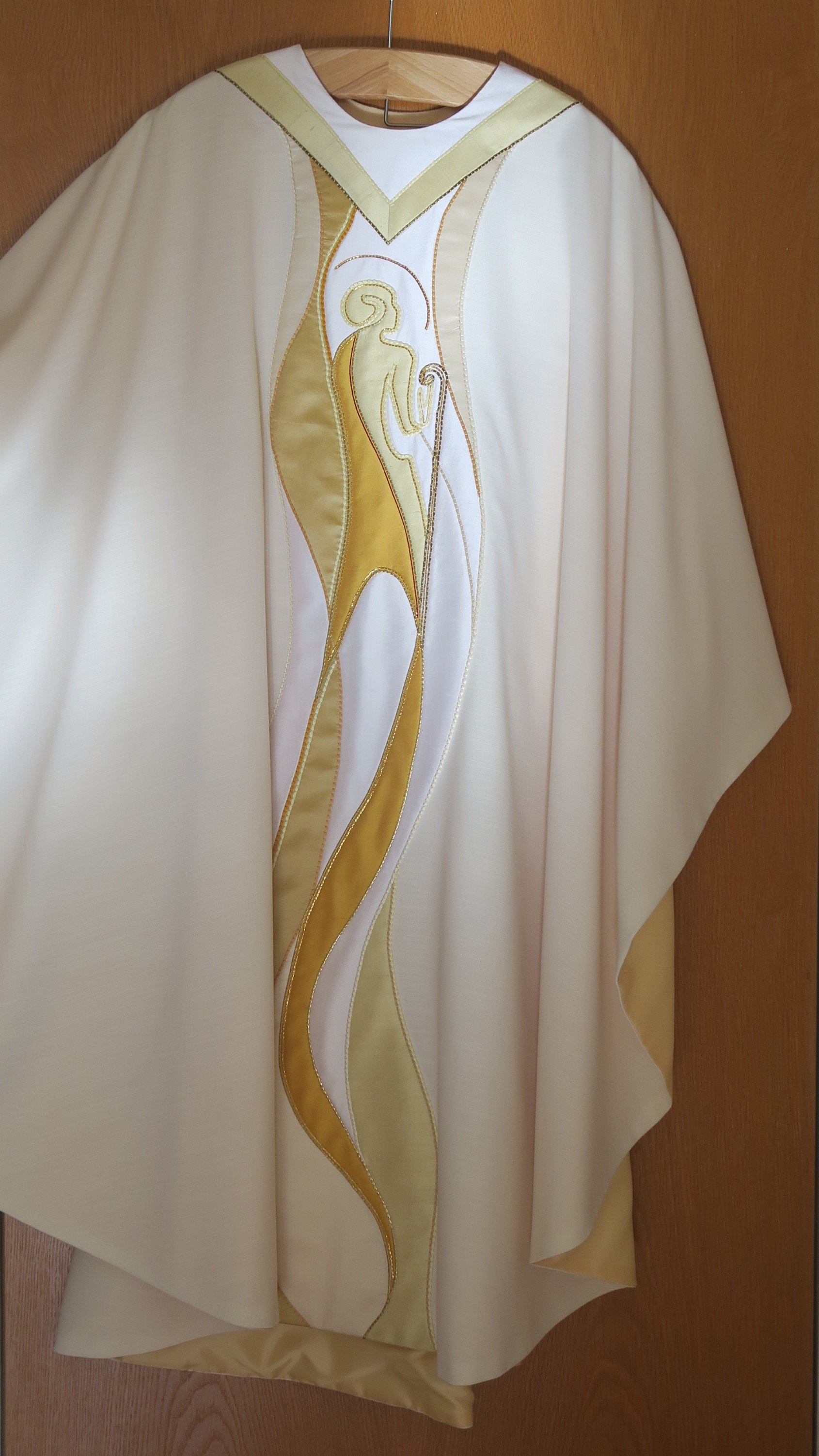 Auf der Vorderseite ist in moderner Darstellung der der hl. Josef mit einem Krummstab zu sehen und die Rückseite des Gewandes zieren Hammer, Säge und eine Reihe von Nägeln als Symbole des Zimmermanns. Die Halsöffnung wird auf beiden Seiten vom Zimmermannswinkel geziert.