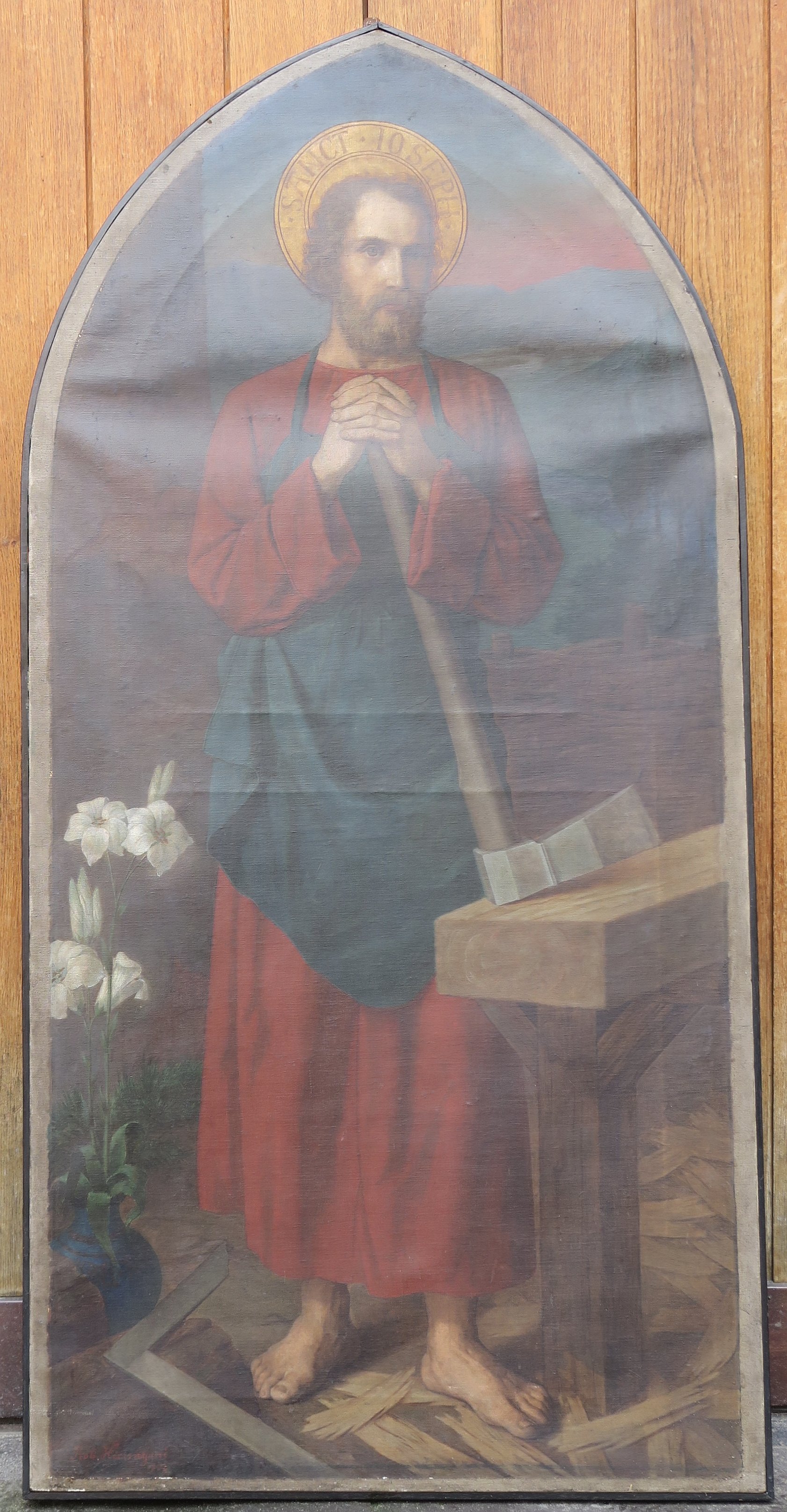Zum Festtag des Hl. Josefs 2021 ist erstmals ein weiteres Bild des Hl. Josefs in unserer Kirche zu sehen. Es wurde im Jahre 1902 ebenfalls von Robert Hieronymi geschaffen, allerdings für die Herz-Jesu-Kirche in Eckenheim, die es direkt vom Maler für 1200 Mark erworben hat. Dort war es nach der Erweiterung der Kirche seit vielen Jahren - fast unbeachtet - neben der Orgel angebracht. Jetzt hat es als Leihgabe für mindestens 1 Jahr seine Heimat an der rechten Wand des Chorbogens der Bornheimer Josefskirche gefunden. Dringend erforderlich wäre es, das Bild einer ausführlichen Reinigung zu unterziehen und die eine oder andere Fehlstelle zu retouchieren.