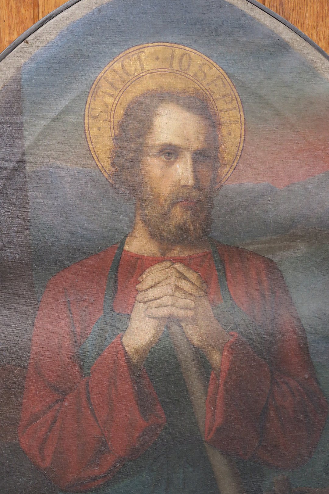 Das Foto des Bildes entstand am 15. März bei seiner Ankunft aus Eckenheim an der Tür der Alten Josefskirche und zeigt deutlich, dass die Leinwand gewellt ist und zwei Knicke in Höhe der mittleren Rahmenverstrebung aufweist. Sicherlich lässt sich dies zumindest beim neuerlichen aufziehen des Bildes auf den Rahmen verbessern, wenn nicht sogar ganzlich beseitigen. Vielleicht gelingt es unserem Verwaltungsrat im Rahmen einer Vereinbarung mit der Pfarrei Sankt Franziskus - zu der Herz Jesu Eckenheim heute gehört - eine Restaurierung des Bildes durchzuführen.