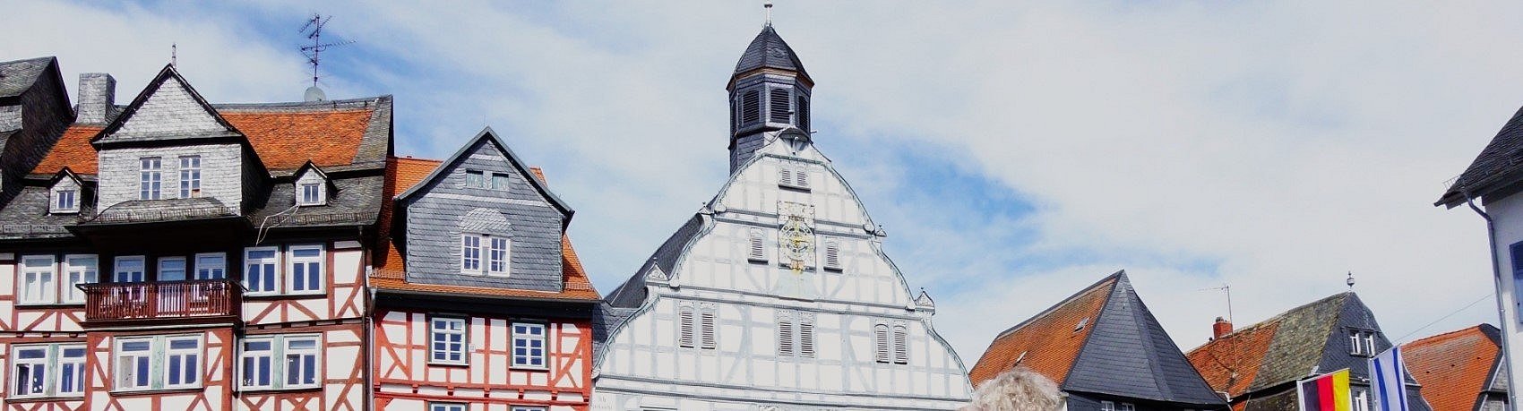 Einer der schönsten Marktplätze Hessens ist in Butzbach zu finden. Umstellt von imposanten, vielgestaltigen und reich verzierten Fachwerkhäusern steht in der Mitte der vom Marktbrunnenmann bekrönte Marktbrunnen, der zum Zeitpunkt des Besuchs der Kunstfreundinnen und –freunde aus dem Osten Frankfurts als Osterbrunnen geschmückt war.