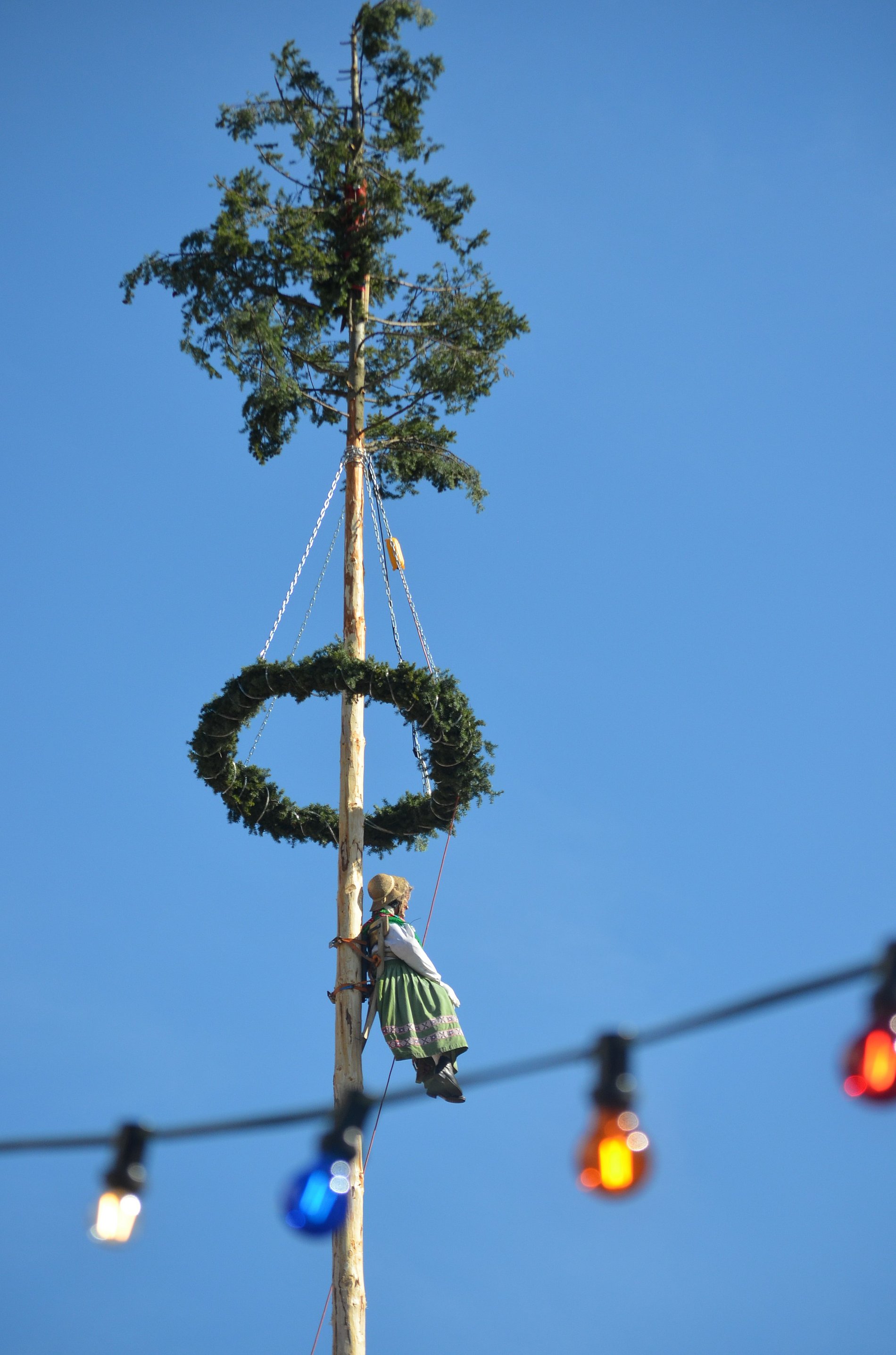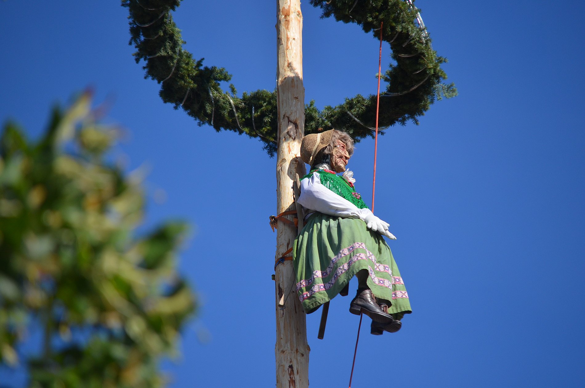 Hoch oben die Kerbe-Lisbeth am Baum, unten auf dem Platz die Gottesdienst-Gemeinde: Am wolkenfreien heißen Kerbesonntag war ein Schattenplatz mitten in Alt-Bernem Gold wert.