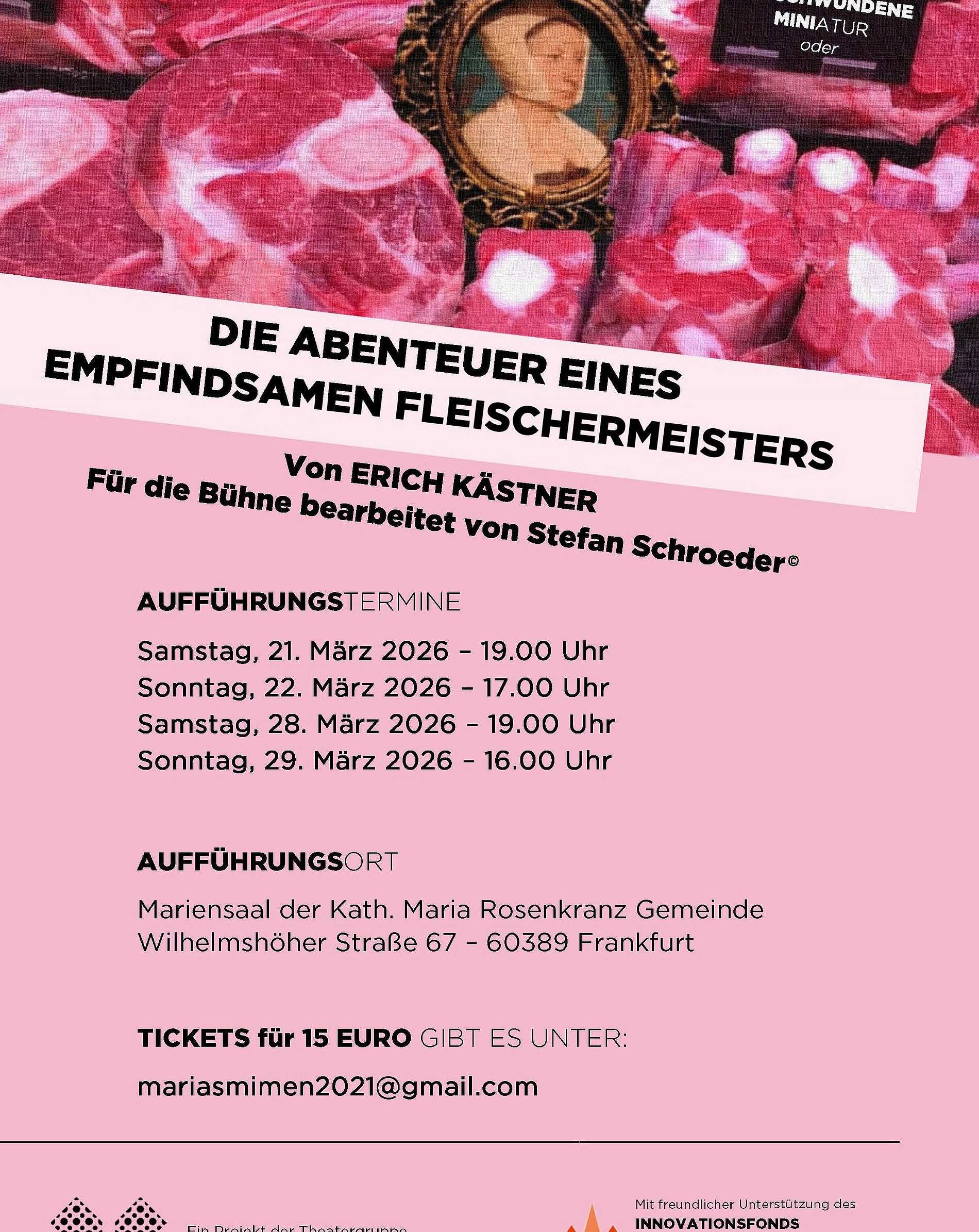 An vier Aufführungsterminen zeigt die Theatergruppe Maria Rosenkranz die Gaunerkomödie mit dem Zusatz "Die Abenteuer eines empfindsamen Fleischermeisters" nach dem Roman von Erich Kästner in einer Bühnenbearbeitung von Stefan Schroeder (Bühnenverlag Weitendorf, Hamburg). Dramaturgisch bearbeitet wurde das Stück, wie auch bereits in 3 vorherigen Theaterprojekten, von Katrin Skok, gefördert wird die Produktion durch den Innovationsfond des Bistum Limburg.