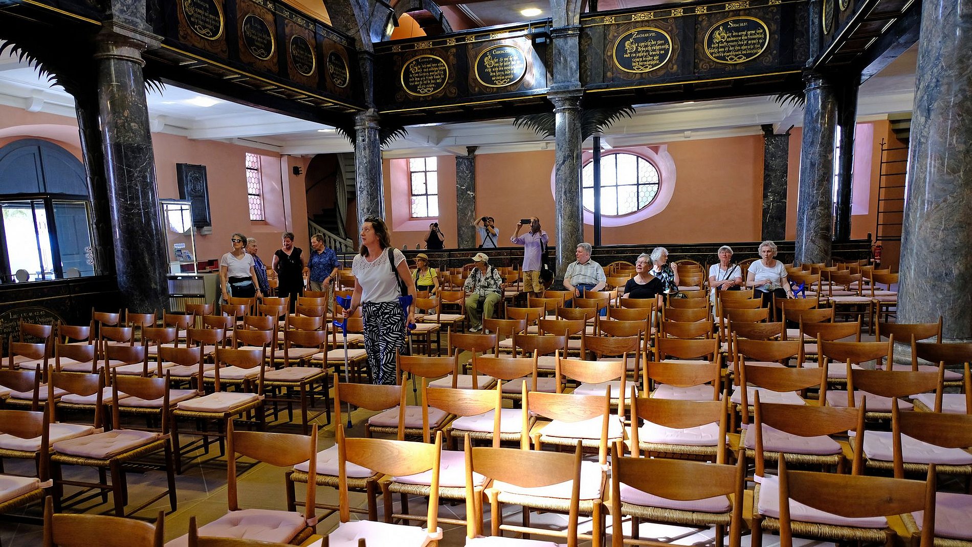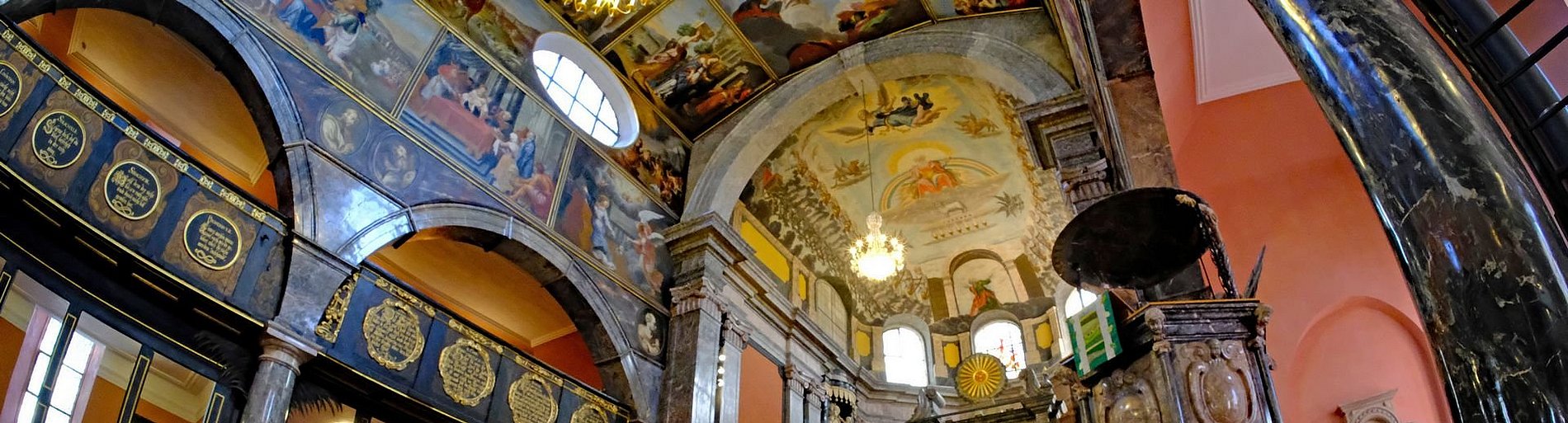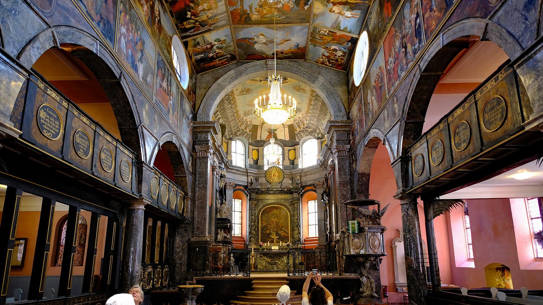 Eine wahre Bilderflut strömte auf die Eintretenden ein. Die Bilder an der Decke und den Wänden zeigen biblische Szenen. Diese Unzahl von Bildern ist für eine protestantische Kirche äußerst ungewöhnlich. Doch Graf Johann von Nassau-Idstein wollte es damals so. Bemerkenswert ist, dass die Deckengemälde aus der Schule von Peter Paul Rubens stammen. So verging die Kirchenführung wie im Fluge und die Augen konnten sich kaum von dieser Kunst trennen. Eine unerwartete Dreingabe war ein Orgelspiel auf der Walckerorgel. Eine gelungene Abrundung.