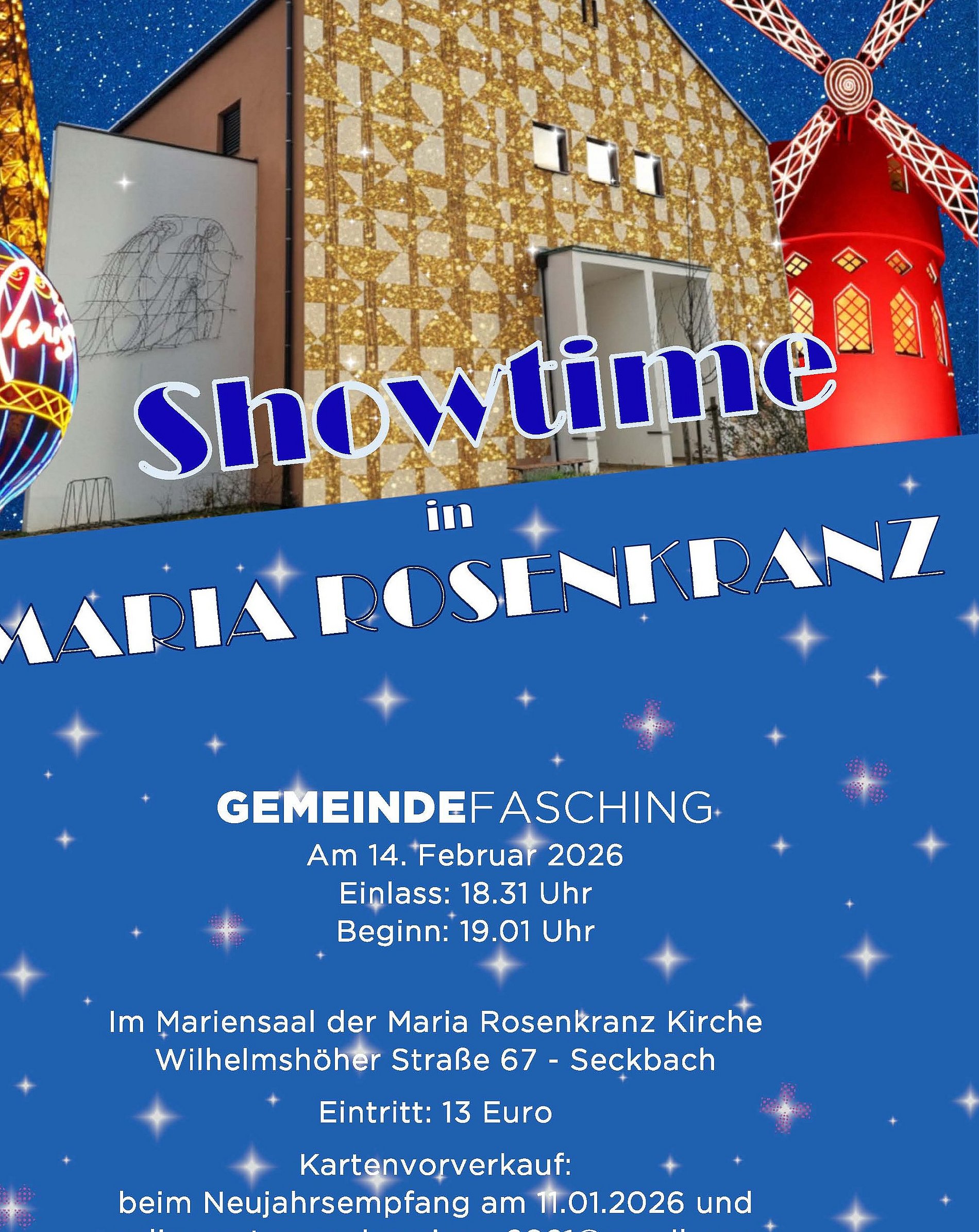 Taucht ein in eine Welt voller Glanz, Glamour und guter Laune, wenn sich unser Mariensaal am 14.02.2026 in eine große Showbühne verwandelt. Ob Stars und Sternchen, Zirkus, Musical oder Hollywood – beim Gemeindefasching in Maria Rosenkranz ist alles erlaubt, was glänzt, funkelt und begeistert.